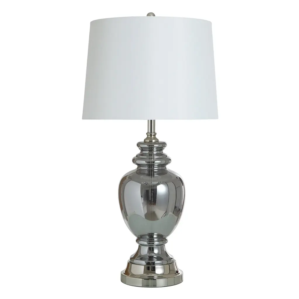 This ceramic table lamp will be sure to add a touch of personality to any room it decorates. The lamp has a rotund base, decorated at the top with large pearl-shaped orbs, and has a porcelain vitreous enamel finish in grey with a glossy effect. A tall, cylindrical off-white fabric lampshade tops this piece.