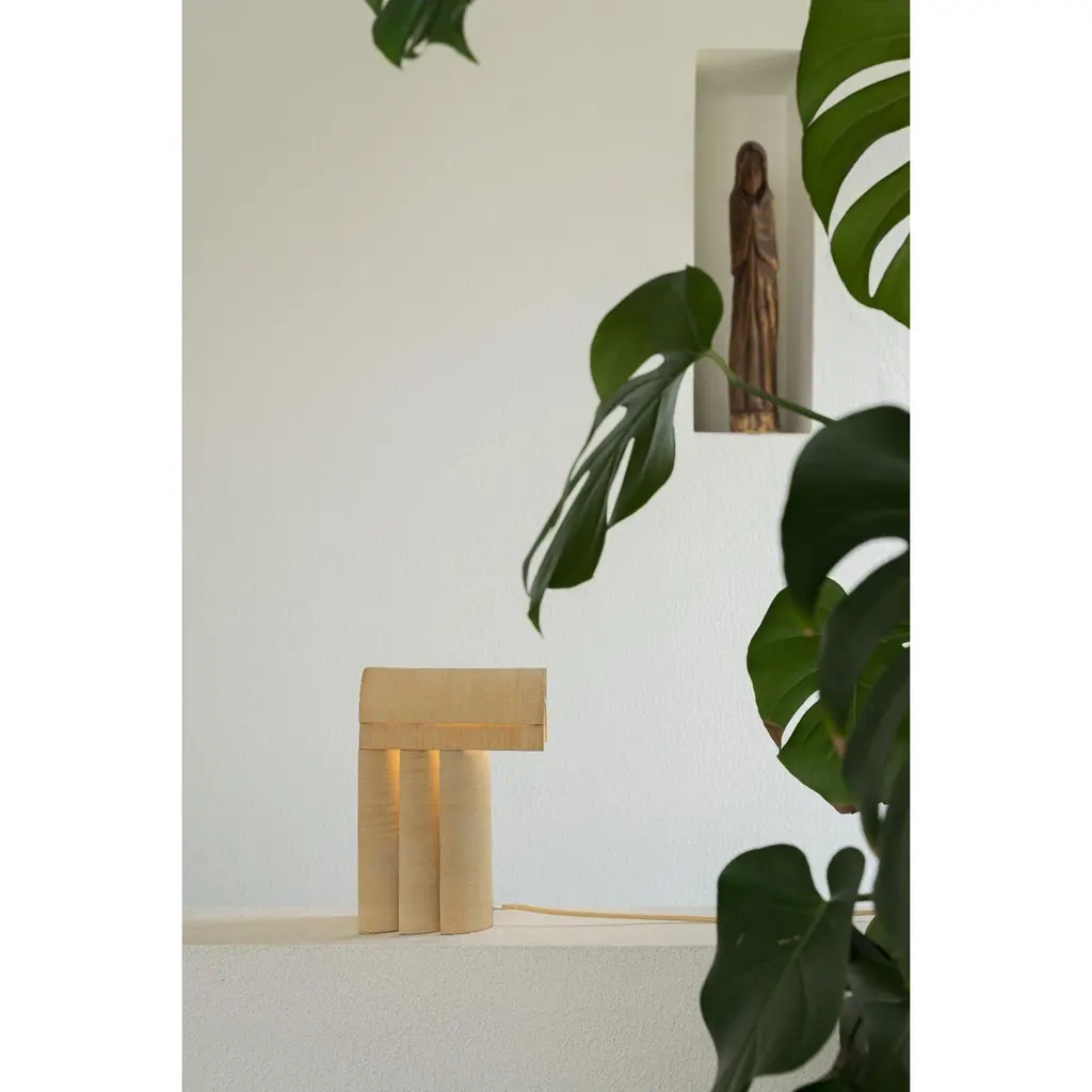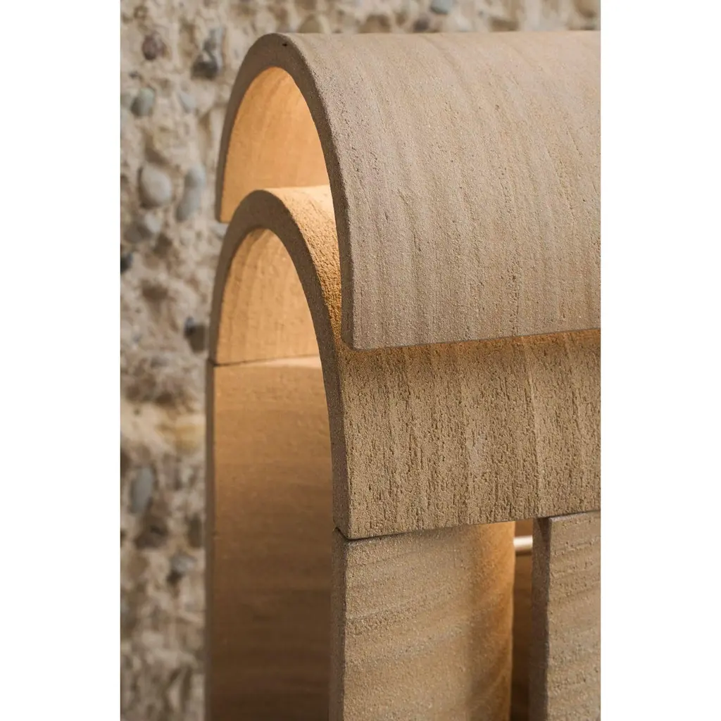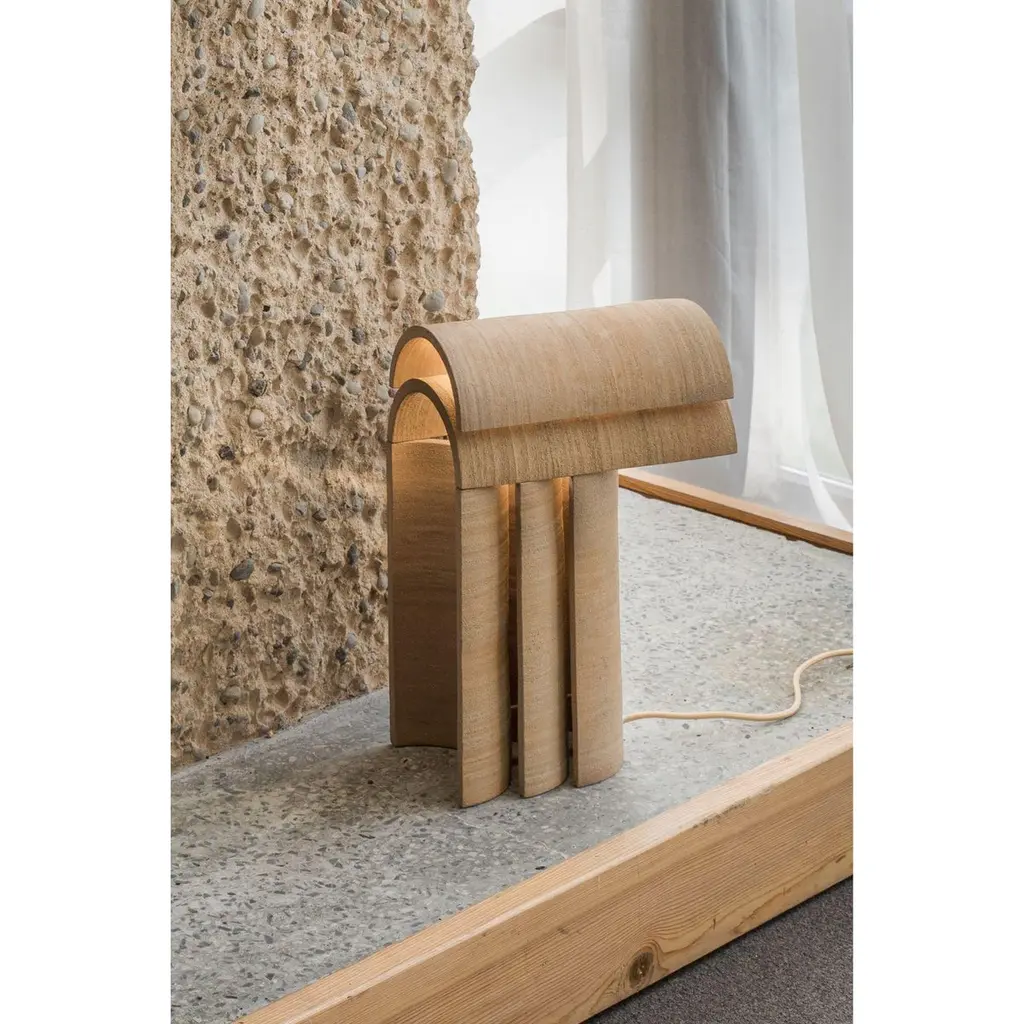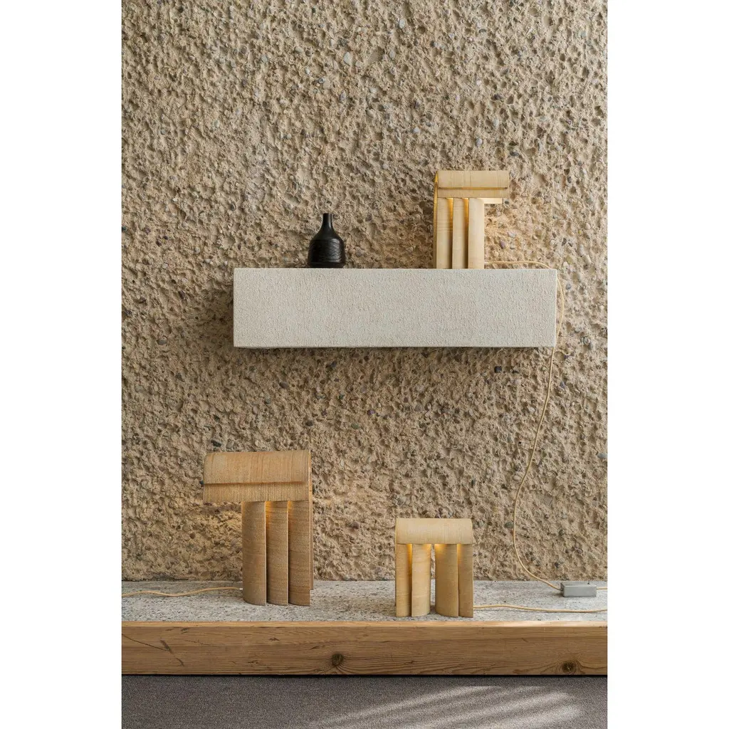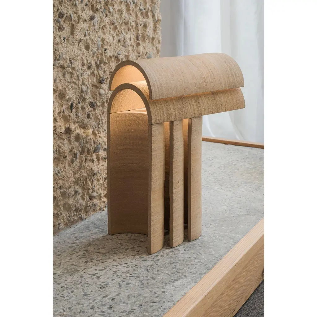 Layers of IIII small lamp by Evelina Kudabaite Materials: StonewareDimensions: D 12 x W 20 x H 28 cm.One of a kind.Small and large sizes available. All our lamps can be wired according to each country. If sold to the USA it will be wired for the USA for instance.The sculptural lighting piece continues the exploration around Industrial structures, architectural elements that surround us. The multi-layered objects were constructed in a spontaneous way by assembling stoneware semi-cylinders as if playing with building blocks. With its rigid structure and matt tactile surface, the light piece balances between modern precision and sensual craftsmanship. The soft shadows highlight the traces of touch left by their maker and makes us aware of the craftsmen behind the object.Since 2015, product designer Evelina Kudabaite keeps on developing and making GIRIA objects. Designer firsthomeware collection launched in 2015 during the London Design Festival. Everyday objects are used, seen, touched. Tactility and expressive qualities of materials have important communicative value, so the design process requires for intense research on textures. GIRIA is a homeware collection balancing between tactility, shape and color. The project is aimed to pass the sensations of the forest through Material, to establish a connection between the user and the object. This collection is result of an experimental process by which it was meant to show how materials, which are destined to become waste - tree bark and leaves - can be transformed into sustainable design through the traditional crafts.It is a research on the alternative and unconventional ways to shape wood, which reminds of the culinary process. During the research a recipe of a unique Material that consists of harmless organic substances has been found. No two items in GIRIA are the same: each is made by hand and the bark dust of diferent kinds of trees gives a unique texture, varying in colour and roughness of a surface. It takes time to make a piece in GIRIA, that is considering preparation of the bark, drying time - from days, to weeks - and variability of the process. All the items are coated with mix of foodsafe oils to make it more durable. The materials in GIRIA may change slowly over time and the collection distinguishes itself from mass production, making the products as individual as their owners.Evelina is a product designer based in Vilnius, Lithuania. Her research usually starts from materials and processes which transform them into design objects. She is fascinated by the narrative hidden in a product and by its power of carrying knowledge, memories and emotions in a more concrete and tactile way. When designing something, she wants to tell a story, to create a reaction of wonder and curiosity in the people who are going to interact with the object.
