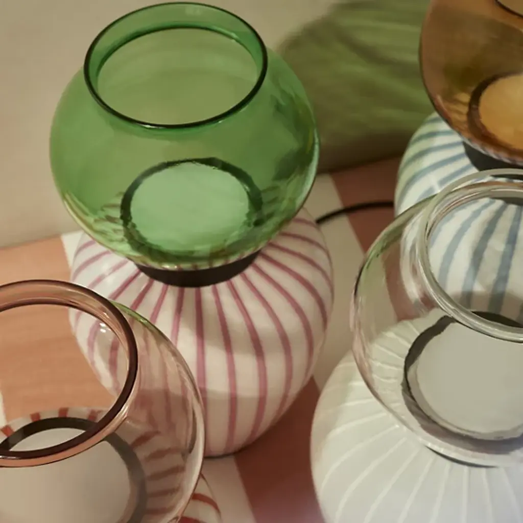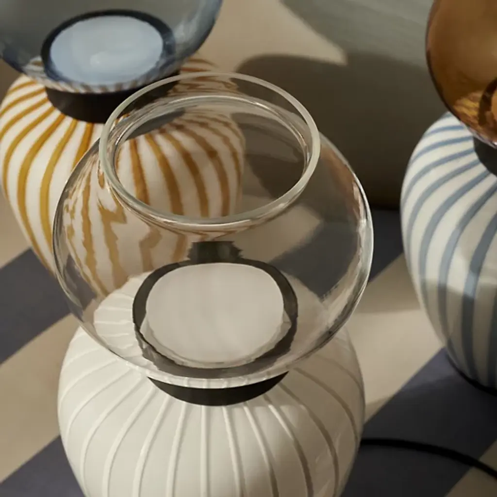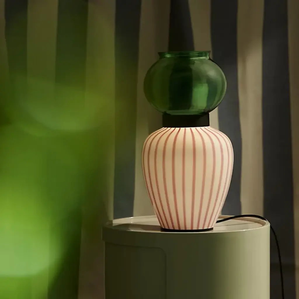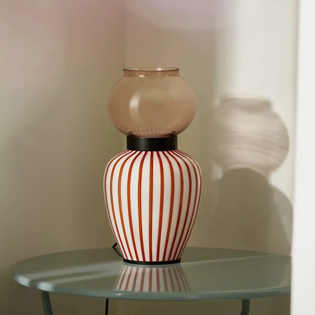 Inspired by traditional nightstand oil lamps, the Layla Table Lamp from MM Lampadari explores the interaction between functional form and decoration as a color-rich luminaire. Artist and designer Serena Confalonieri's work blends graphics, colors, and geometry with a playful twist. This piece's blown glass pairing of shades sports familiar curves that surround the lamping for minimal glare. The opaque bottom shade guides the eye with its elegant, curvaceous stripes. A transparent shade above brings balance to its shine and single color. When lit, new hues are created as warm light filters through the evocative glass forms.