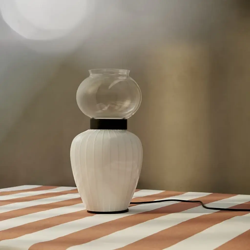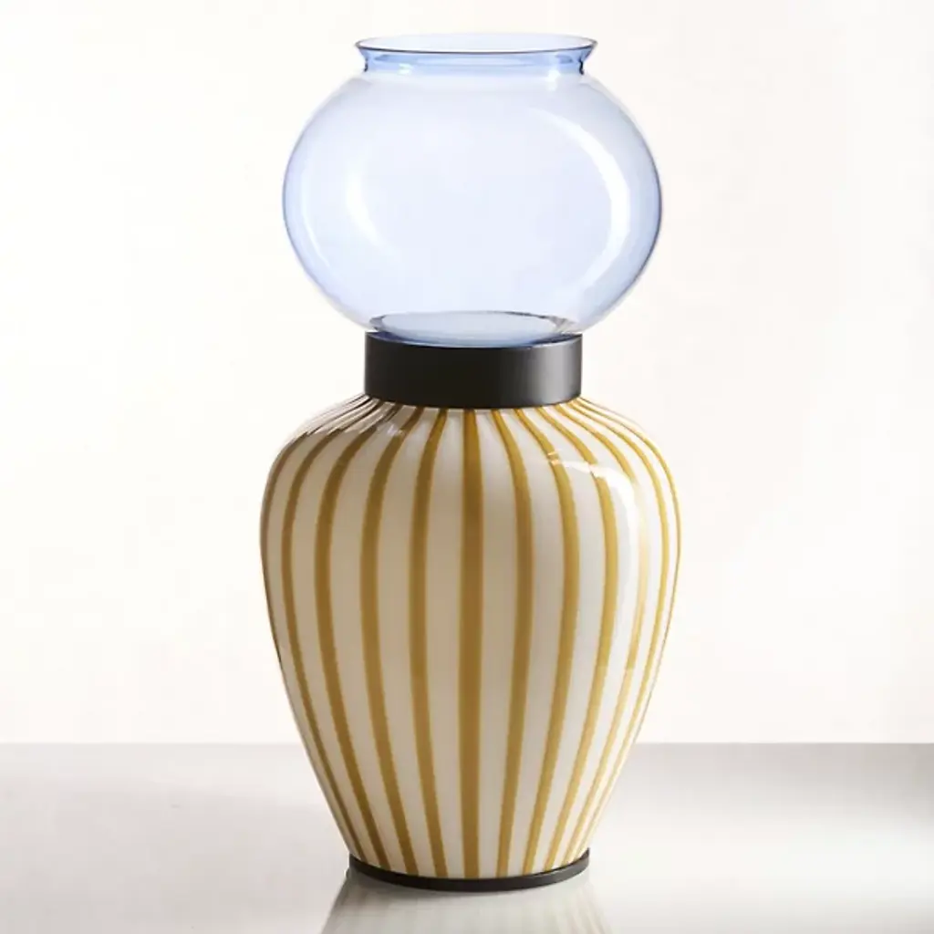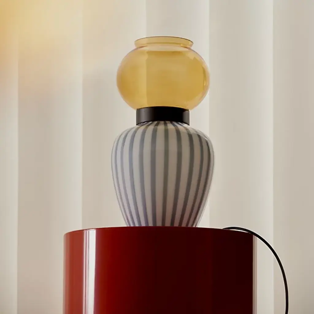 Inspired by traditional nightstand oil lamps, the Layla Table Lamp from MM Lampadari explores the interaction between functional form and decoration as a color-rich luminaire. Artist and designer Serena Confalonieri's work blends graphics, colors, and geometry with a playful twist. This piece's blown glass pairing of shades sports familiar curves that surround the lamping for minimal glare. The opaque bottom shade guides the eye with its elegant, curvaceous stripes. A transparent shade above brings balance to its shine and single color. When lit, new hues are created as warm light filters through the evocative glass forms.