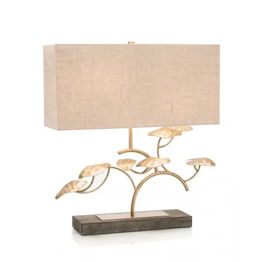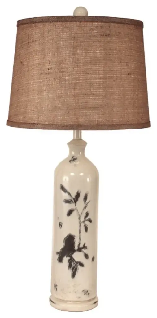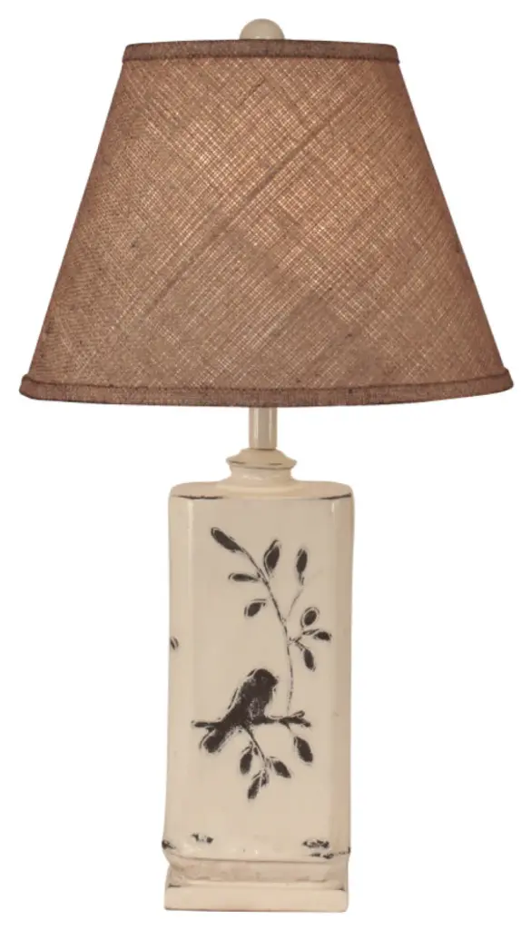 This beautiful lamp features birds perched on a twisted tree branch finished in an antique blue and green finish on a brown base. Our lovely tree-like lamp is brimming with charm that will add a unique chic appeal to your home. The lamp comes with an oval hardback shade in a natural linen. The shade measures 19'' x 19'' x 10"H. The lamp measures 23'' H.