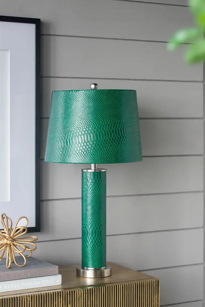 Harness the power of impeccable lighting with the Crocodile Textured Faux Leather Table Lamp.; Unlike your traditional lamp, this table lamp boasts a textured and faux leather finish that sets it apart from the crowd.; Use this table lamp as a unique approach to complimentary lighting in your living room or home office.; Measurement:14x14x27(Inches),Weight:3.5lbs.Assembly Required: Yes; Product Details: 50% Pu,50% Iron