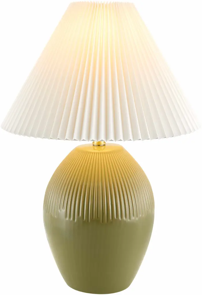 Collection: Lechbruck Colors: Green, White, Metallic Gold, Translucent Material: Body: Ceramic / Base: Iron / Shade (Outside): Linen / Shade (Inside): Polyester Styles: Contemporary Made In: China Lighting Type: Accent Table Lighting Base: Iron Shade Material: Linen, Polyester Shade Color: White Cord Length: 6' Switch Type: On/Off Number of Bulbs: 1 Socket Type: E-26 Bulb Wattage: 100W