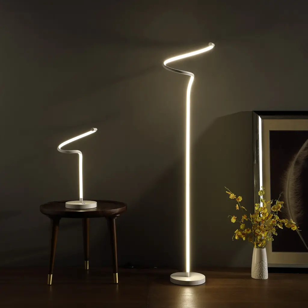 Brighten up a modern space with the stunning glow from this Curvilinear S-Curve Spiral LED table lamp. Revel in modern expressionism with the sculpture-inspired silhouette where the LED Bulb becomes part of the silhouette of this table lamp. Constructed of metal and aluminum, the matte white finish boasts a reflective and visually striking glow. Interesting twists and curves bring a contemporary update to the energy-efficient LED light. Great for a side table in an up-to-date living room or on a nightstand, this lamp makes a bold statement and Illuminating a living room space efficiently. An On/Off multi-functional push-button dimmable switch placed on the base of the lamp for easy access. Press the 1st time to turn ON, press longer to adjust the brightness of the lamp, lets you adjust the light levels to suit your taste and mood. If press the third time to turn off the lamp. The design makes a great light source next to any living spaces, or use in an office setting as a bright work light. Integrated LED fixtures come built in into the fixture. They are designed to provide a specific color and Lumen output and they do not have typical "bulbs" that can be replaced. Integrated LED fixtures typically last for many years, often a decade or more. • LED 12W for energy-efficient use. • CR>=40. Lumen 850. CT 3100K • Integrated LED Bulb built-in on the Linear Body Pole. • On/Off Button Dimmable Switch sitting on the base of the lamp. • Fully Assembled. • Linear LED/Metal Body Tube measures 8.25"L x 17"H. • Metal Base measures 7"L x 7"W x 1"H. • Input: 110v, 60Hz. • Black Cord measures 76"L. • UL Listed. • Wipe with a damp cloth for cleaning.