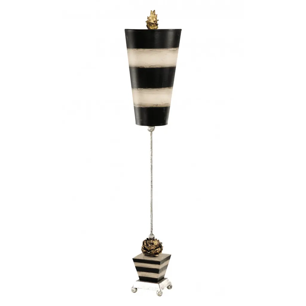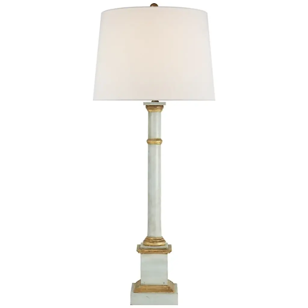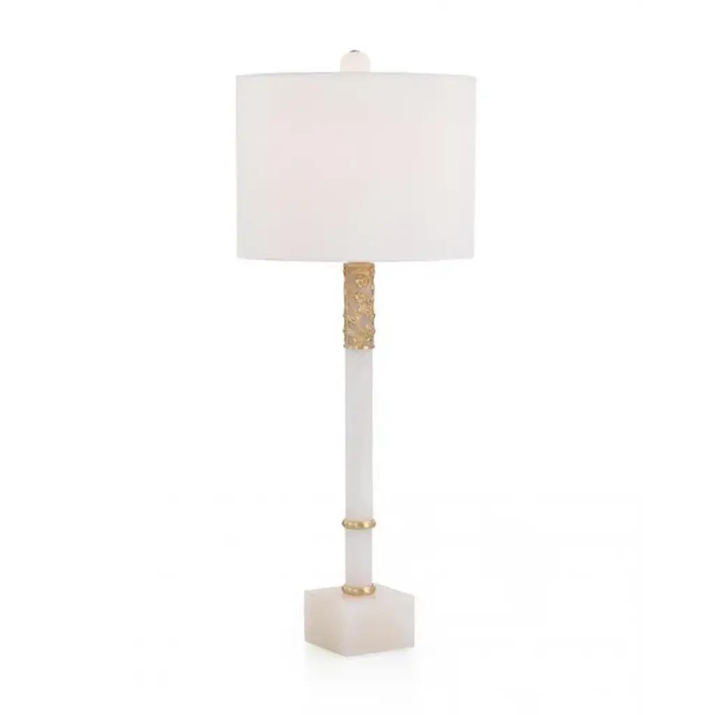 The Leda Table lamp is a collection of all the colors and designs we love blended into a beautiful 32" table lamp. The base is 6.5" square width and the gold leaf element at the top of the base finishes a traditional look with flair. The antique white tapered drum shaded is perfect.