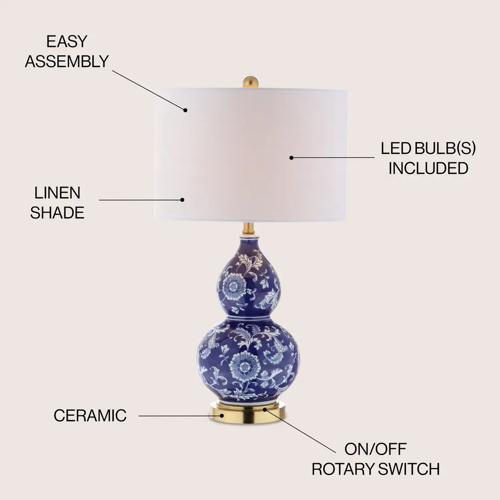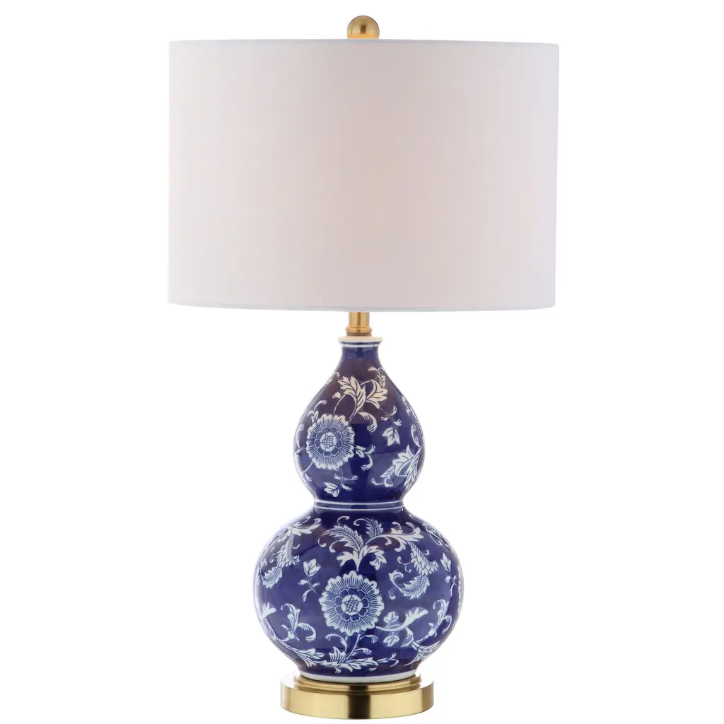 Chinoiserie chic, a blue-and-white floral motif makes this ceramic table lamp a stylish addition to any space. With a base in a brass finish and a finial to match, the double gourd shape will shine in any style of décor. Finished with a silk-wrapped cord, this gorgeous piece will surely be an heirloom of tomorrow. Features:Dimensions:About us:You see a lamp.We see a decorative work of art.A perfectly curved shade casts a dramatic shadow on a floor. A silk cord you never want to hide. LED lightbulbs: as easy on the environment as they are on the eyes. The JONATHAN Y Lighting collection considers every detail from impeccably sourced materials to designer styling. And our prices are so attractive, we've transformed a functional necessity into a fashion accessory.JONATHAN Y Lighting … a fashion revolution in home décor.