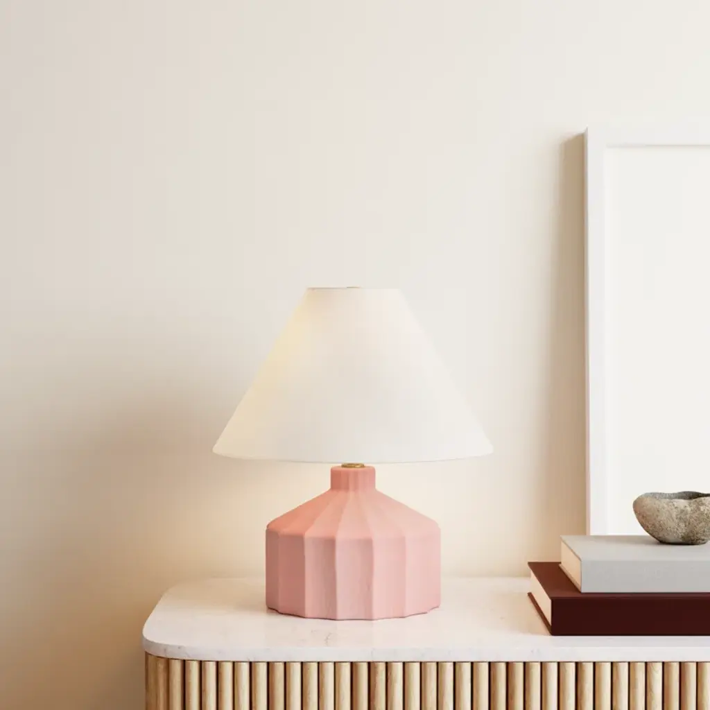 Here's a ceramic table lamp full of bold dimension and eye-catching mod style. Designed by Kelly Wearstler, it strikes a squat, vase-like silhouette with a textured, ridged surface that brings an artful vibe to any room. Resting on top is a linen empire shade that tempers the glow from the included LED that is easily controlled with the help of a rocker switch. Place it on an end table or next to your bed to cast a soothing, serene glow throughout your space.