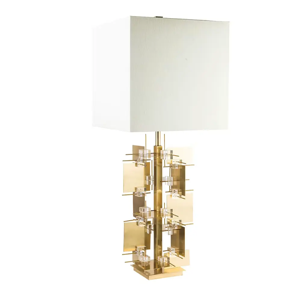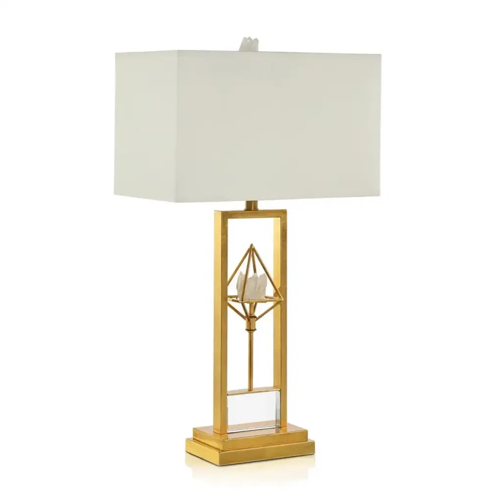 The Legacy Table Lamp is a gorgeous statement piece that commands attention within a space. The metal body in a Gold Leaf finish displays an architectural silhouette with a two-tiered base and a clear crystal accent. A geometric motif in the center that contains a white quartz crystal, blending natural materials with metallic tones. The look is completed by a white quartz finial and a white box shade with rolled edges.