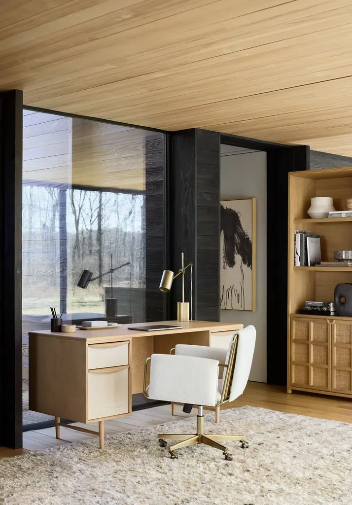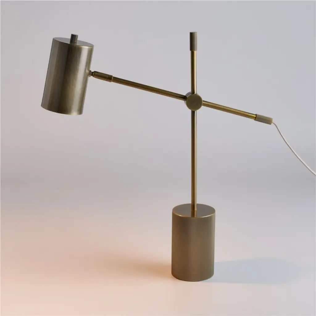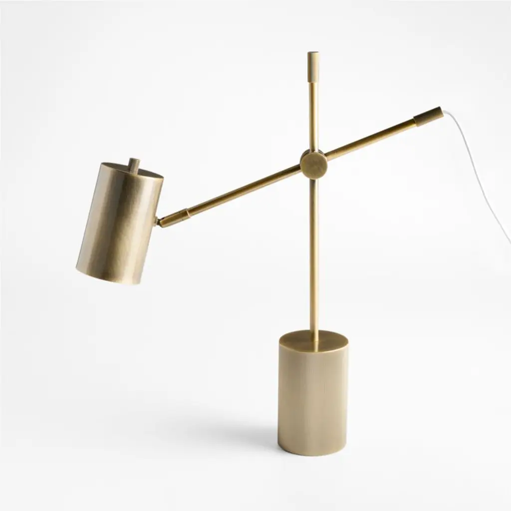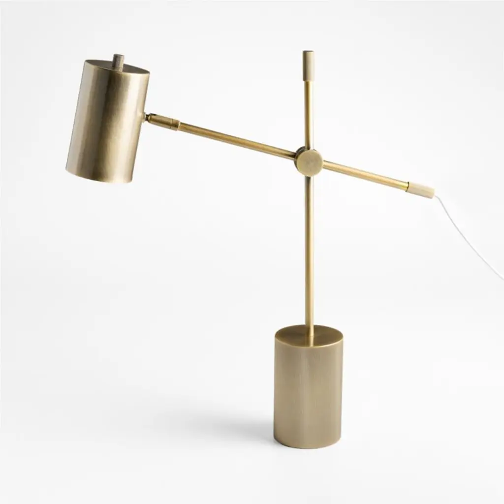 Our minimalist take on a task lamp, Lemaire streamlines this lighting essential into clean cylinders. The columnar base is echoed in the shape of the shade, connected by slender rods capped by knurled finials. Finished in burnished brass, this table lamp brings a golden gleam and focused light to your desk, side table or nightstand.