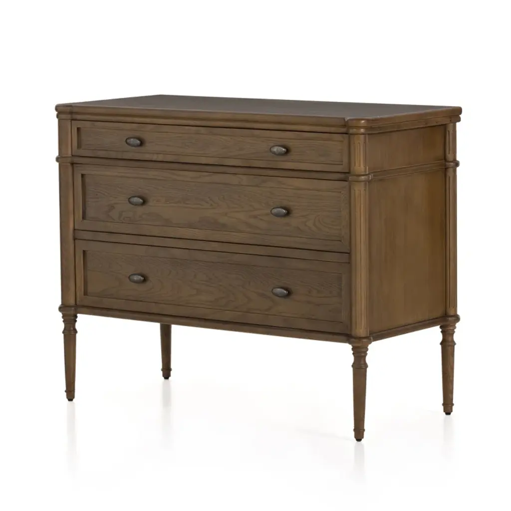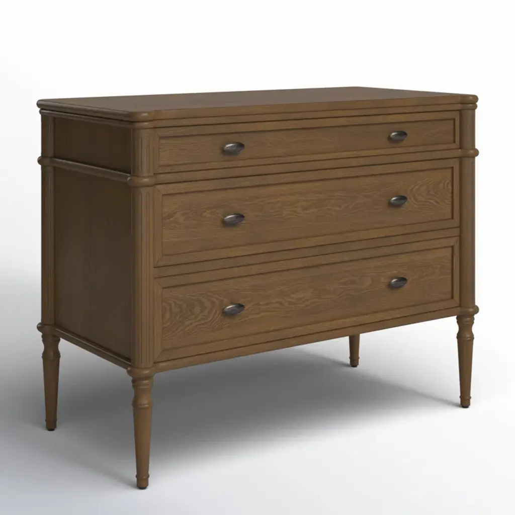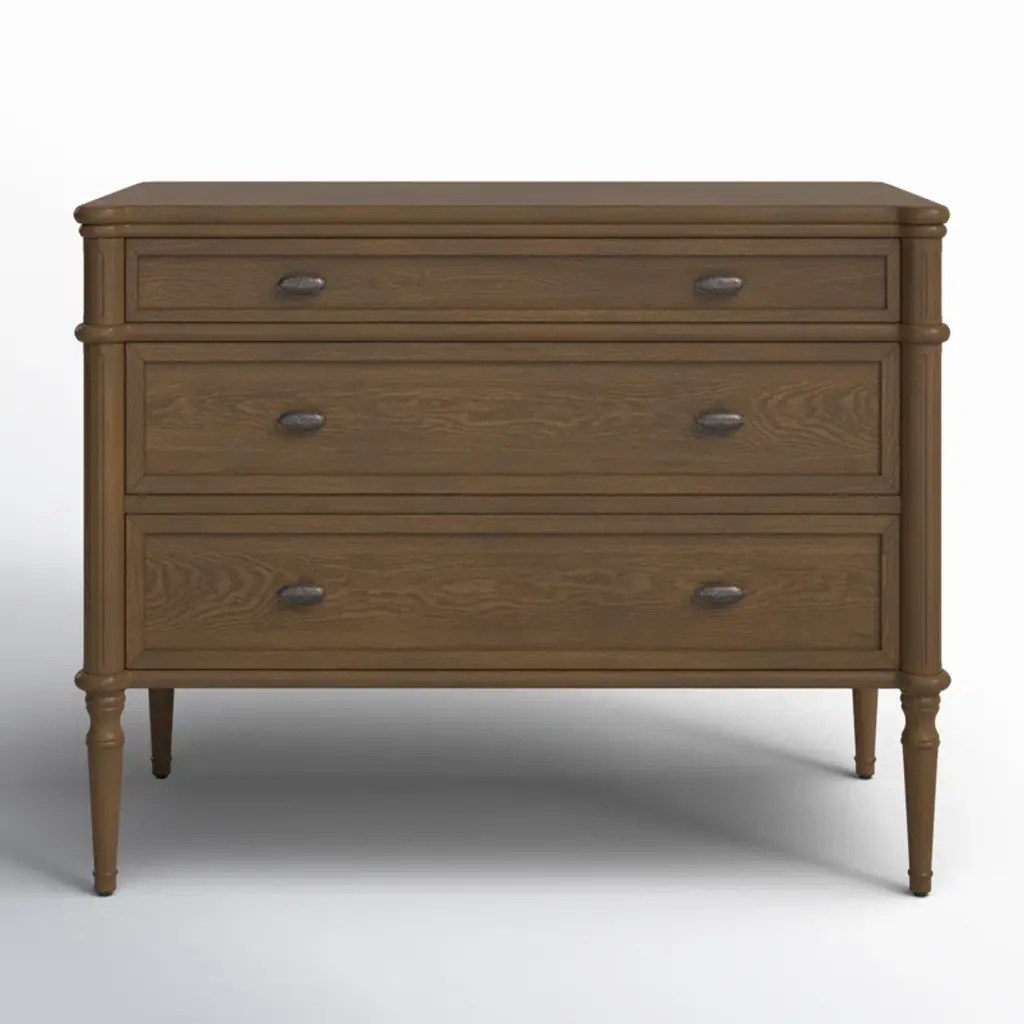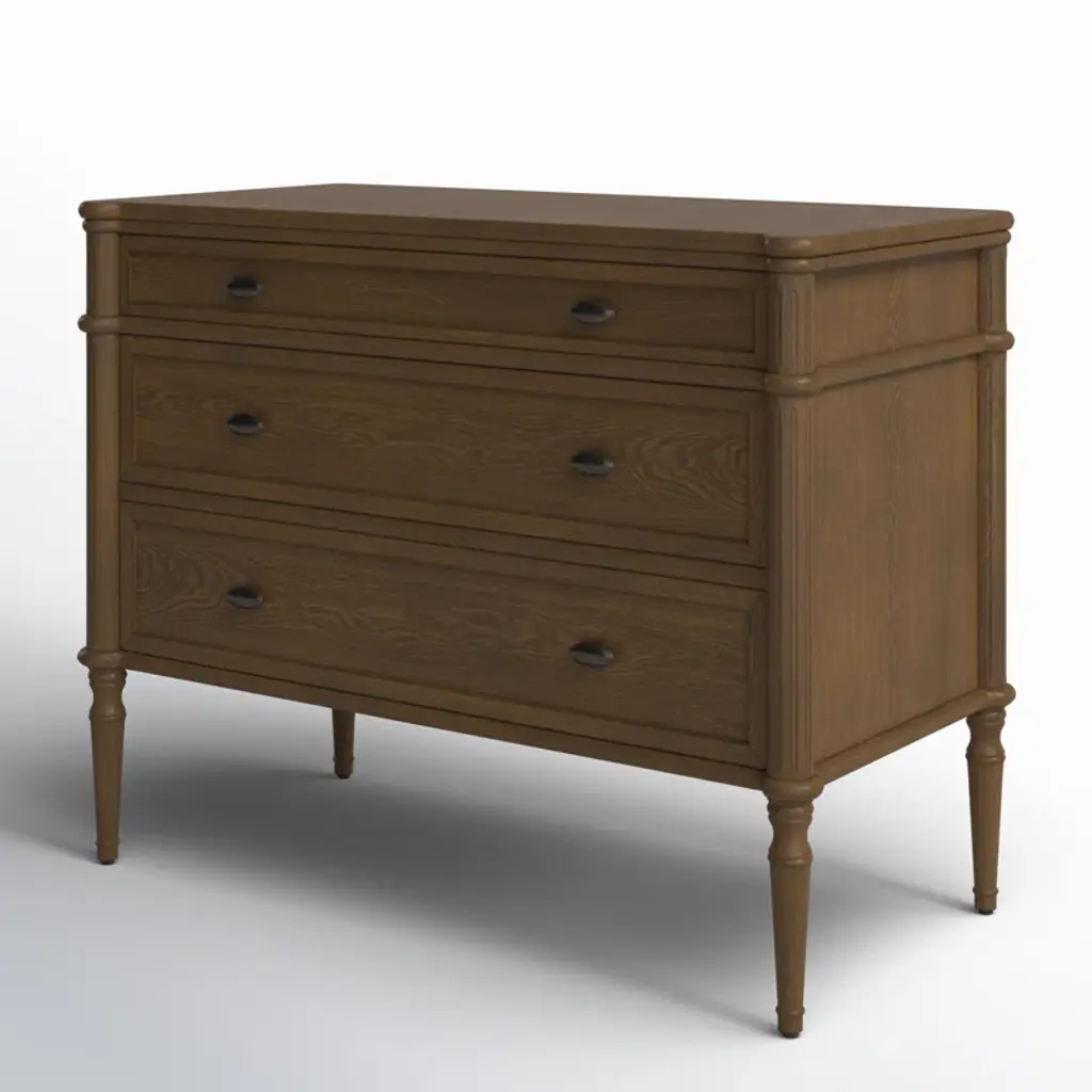 This French-inspired metal dresser brings an elegant look to your bedroom or guest room with its turned leg detailing and classic molding. Crafted from iron in a matte black finish, it features an ogee edging on top for added sophistication. The dresser has three spacious drawers that open and close on smooth side-mount metal glides, providing ample storage for your clothing, delicates, and accessories. And the black knobs round out this design. Plus, there's space on the surface for a small table lamp and accent pieces. A tip-over restraint device is included.