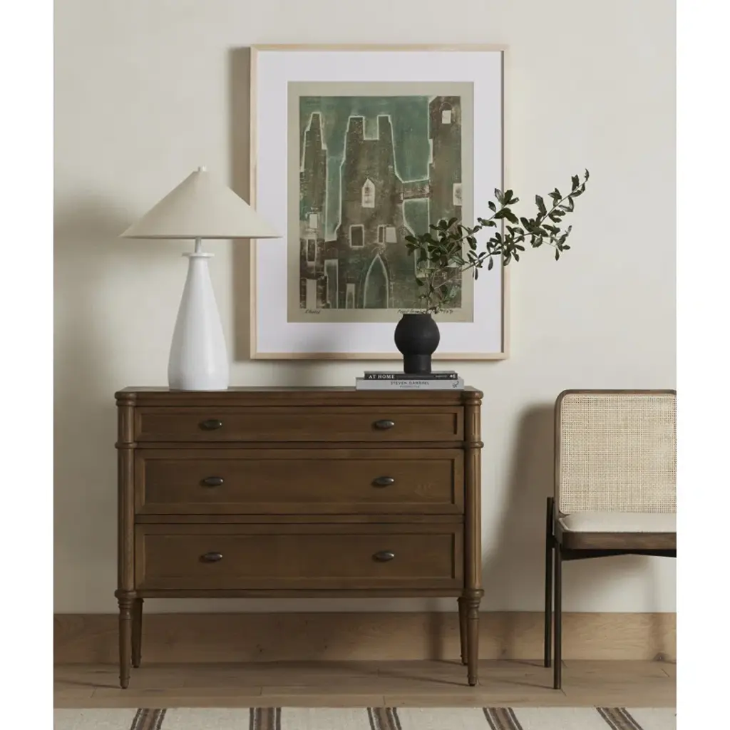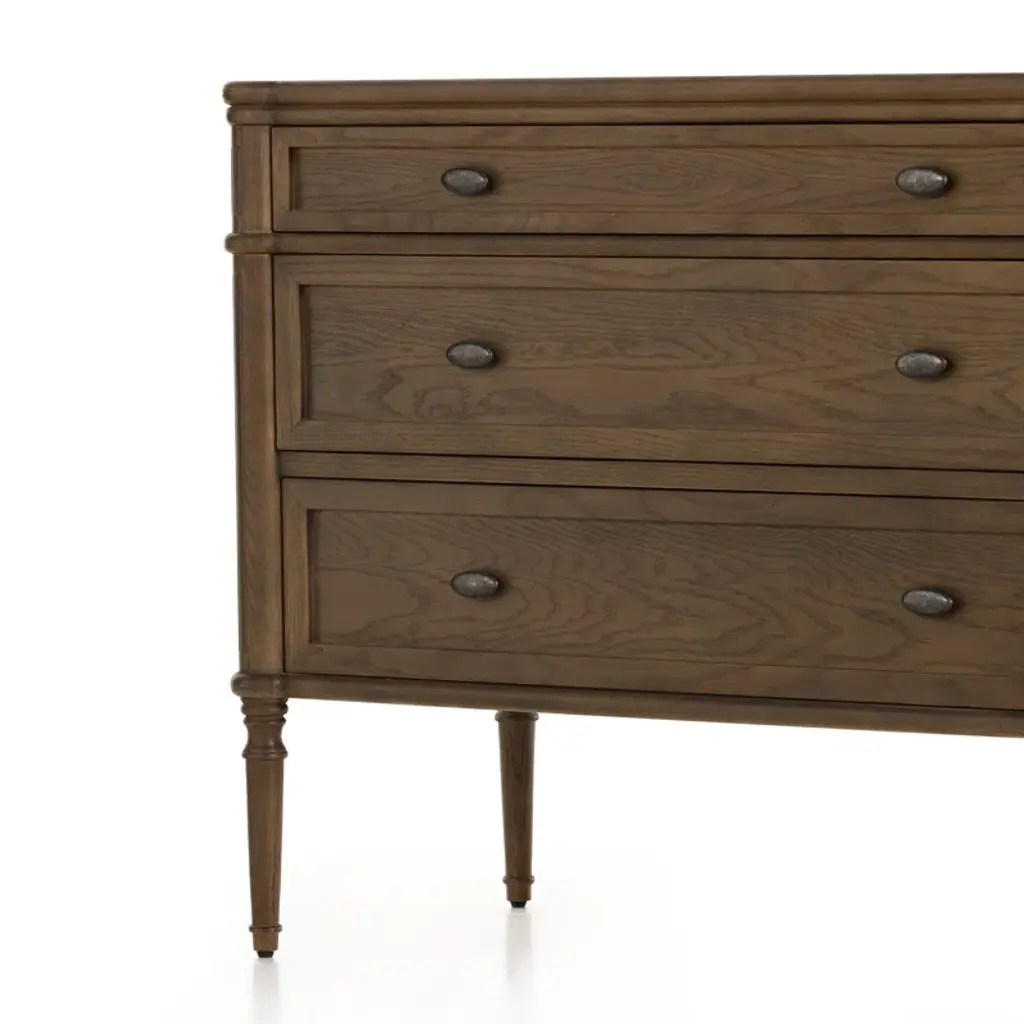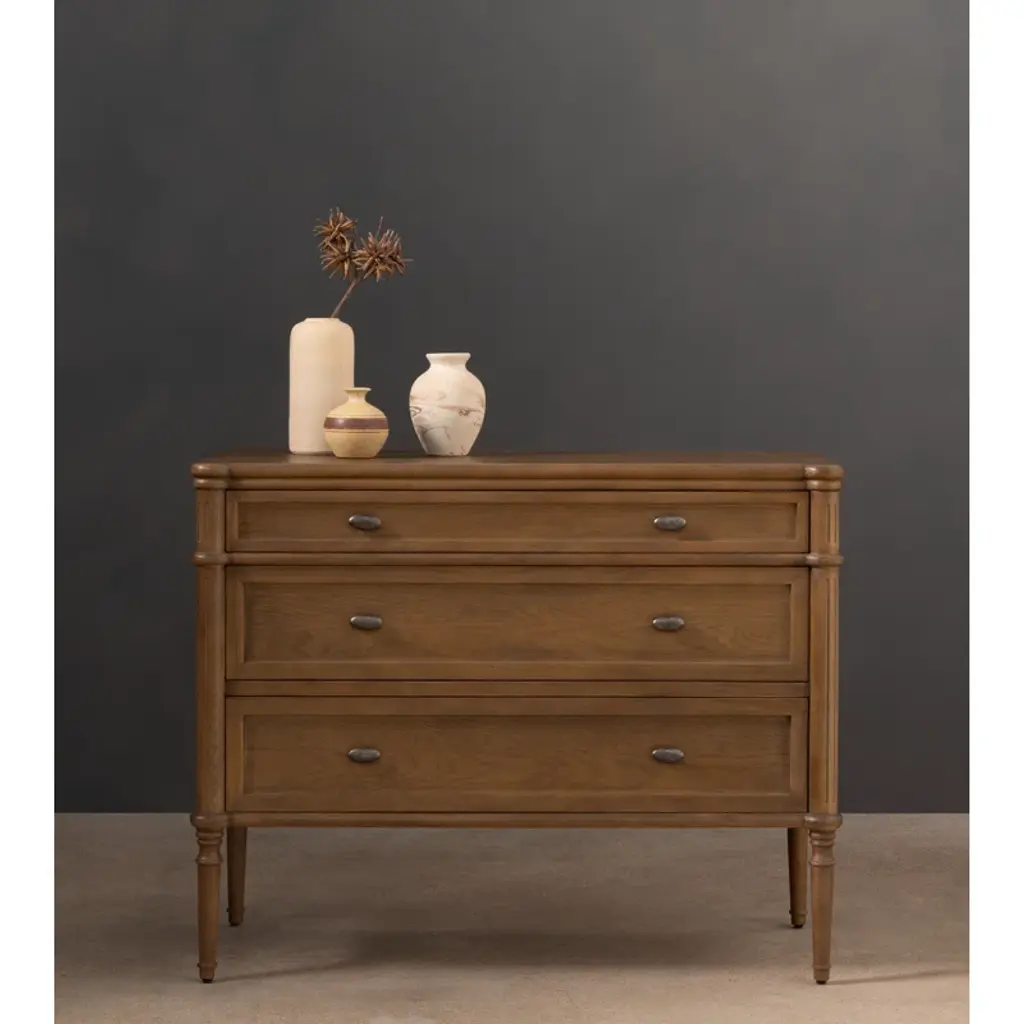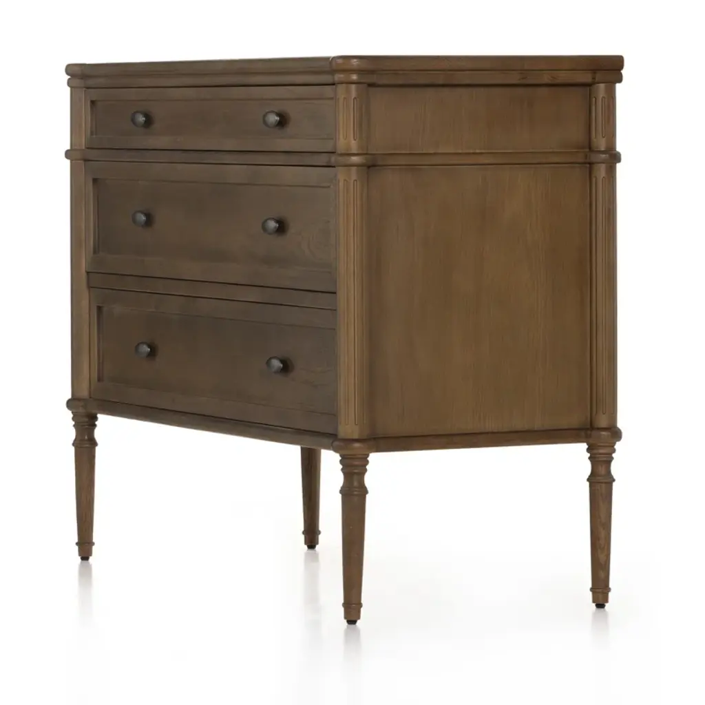 This French-inspired metal dresser brings an elegant look to your bedroom or guest room with its turned leg detailing and classic molding. Crafted from iron in a matte black finish, it features an ogee edging on top for added sophistication. The dresser has three spacious drawers that open and close on smooth side-mount metal glides, providing ample storage for your clothing, delicates, and accessories. And the black knobs round out this design. Plus, there's space on the surface for a small table lamp and accent pieces. A tip-over restraint device is included.
