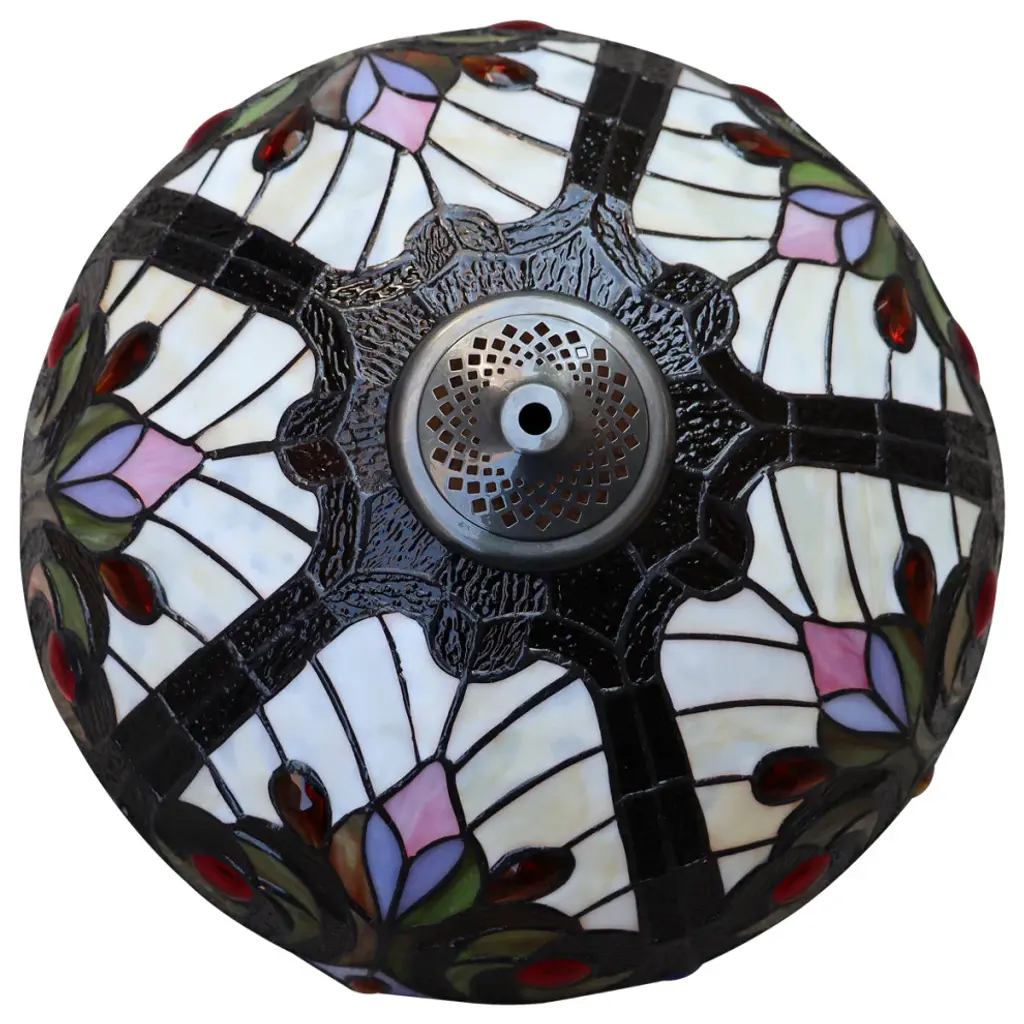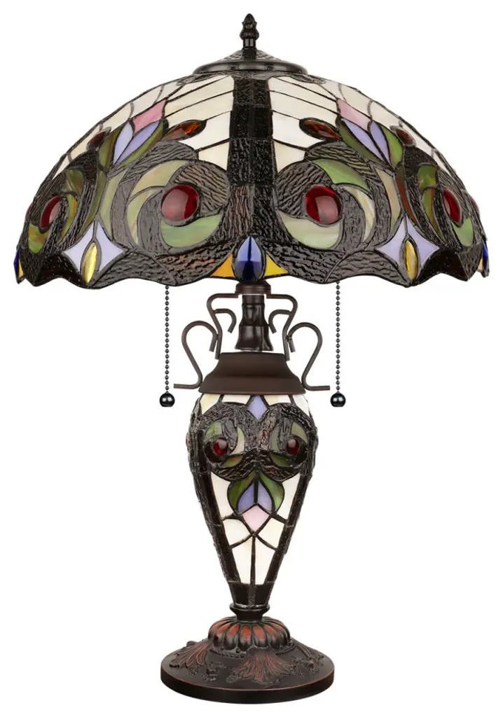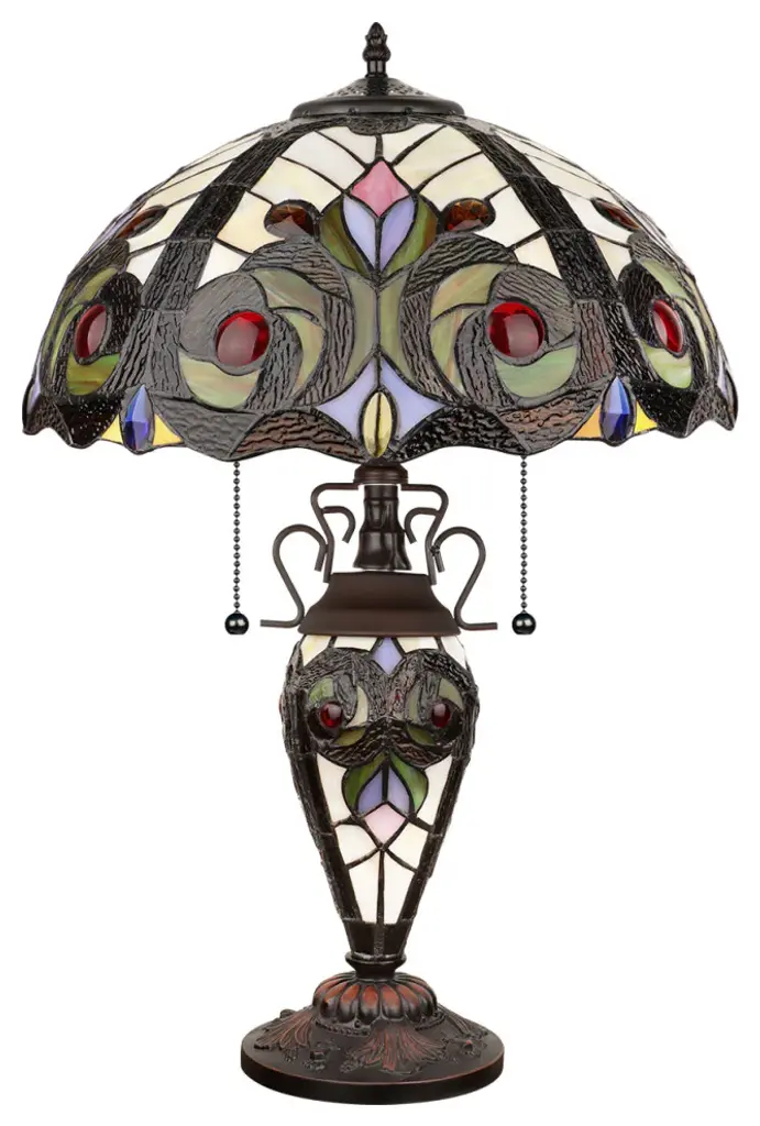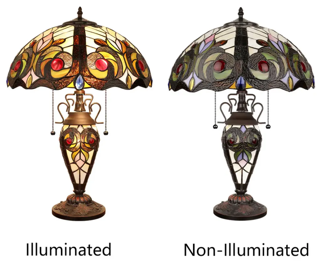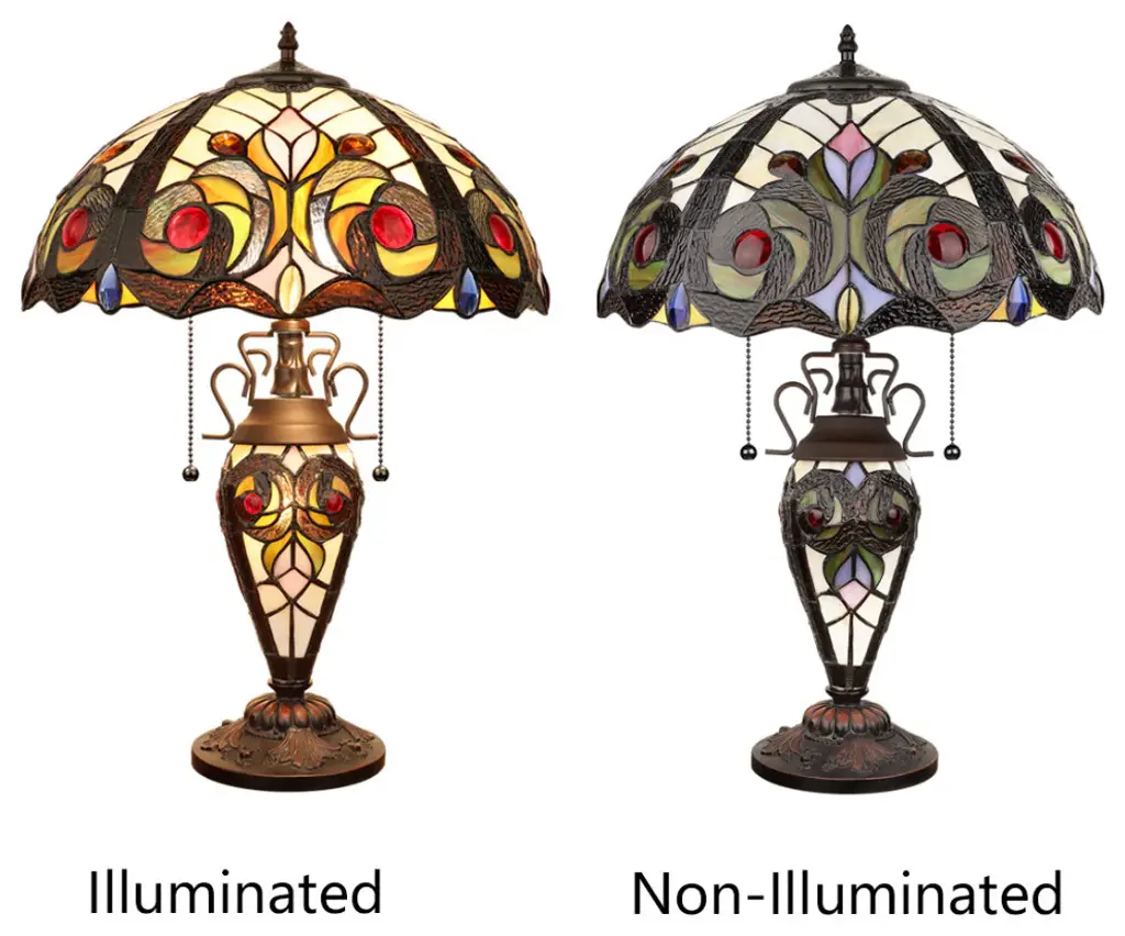 Lennon is a stunning 3 light double-lit table lamp, featuring a beautiful victorian shade. This piece would be perfect by a bed or in a foyer. Each shade is hand-crafted, using the same methods developed by Louis Comfort Tiffany in the early 1900''s. This process entails using 418 hand cut stained art glass pieces and 36 glass beads, each wrapped in fine copper foil and soldered together at extremely high temperatures to form each unique piece. Exact size to the nearest inch may vary, and exact color of each glass piece may vary due to each piece being hand crafted. First image is with the light shining through, second image is with no light. Dry listed and recommended for an indoor setting.