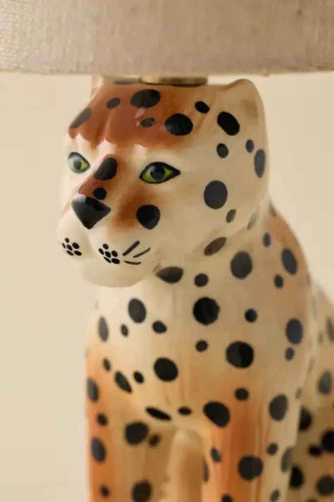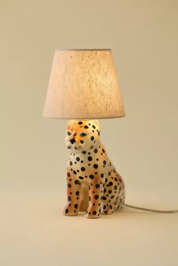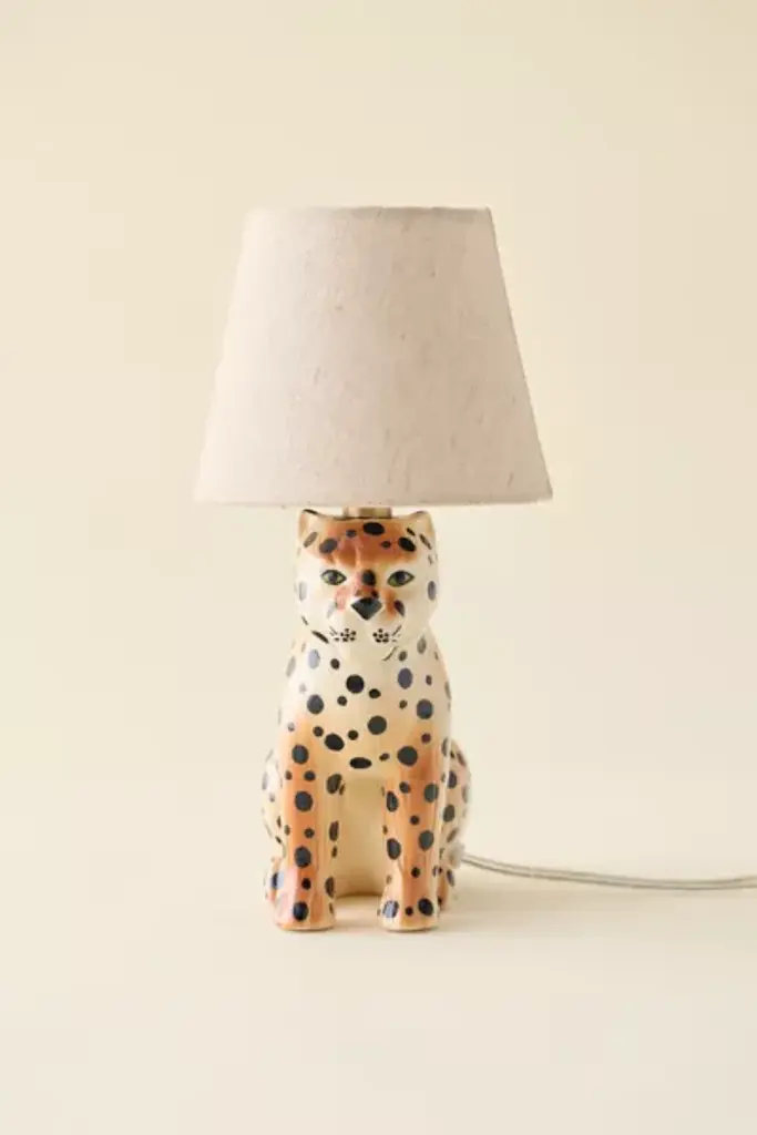 Go wild with your unique lighting displays with the help of this ceramic bedside lamp. This bedside lamp features a posing leopard-shaped base sculpted from ceramic with a tapered, woven fabric shade. Available exclusively at Urban Outfitters. **Features** \- Leopard Ceramic Table Lamp from UO Home \- Ceramic bedside lamp with a statement, leopard-shaped base \- Woven fabric tapered lamp shade \- Requires one 40W (MAX) Type A incandescent bulb or a 6W LED bulb - not included \- Plug in \- UO exclusive **Content + Care** \- Ceramic, fabric \- Wipe clean \- Imported \- Made in compliance with US electrical standards. To use this item outside of the US, pair with an outlet adapter and voltage converter made specifically for use in your location. **Size** \- Wattage: 60W \- Overall dimensions: 6"l x 9"w x 13"h \- Base dimensions: 4"l x 7.5"w x 7.5"h \- Shade dimensions: 4"l x 6"w x 5"h \- Cord length: 8.2 ft \- Weight: 2.4 lbs \- Shipping package dimensions: 12"l x 11"w x 14"h \- Shipping package weight: 4.4 lbs