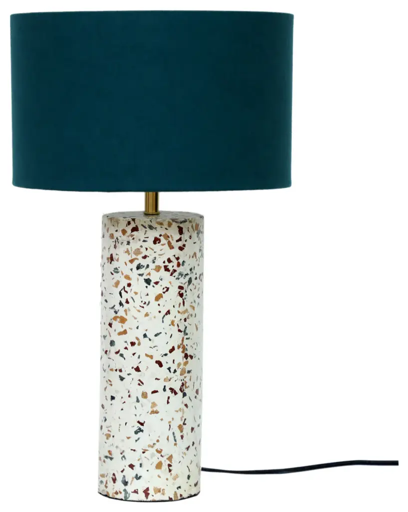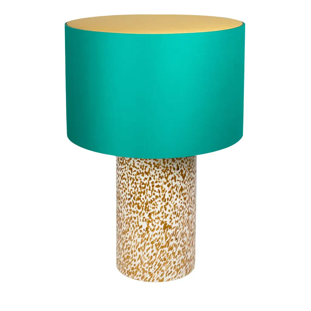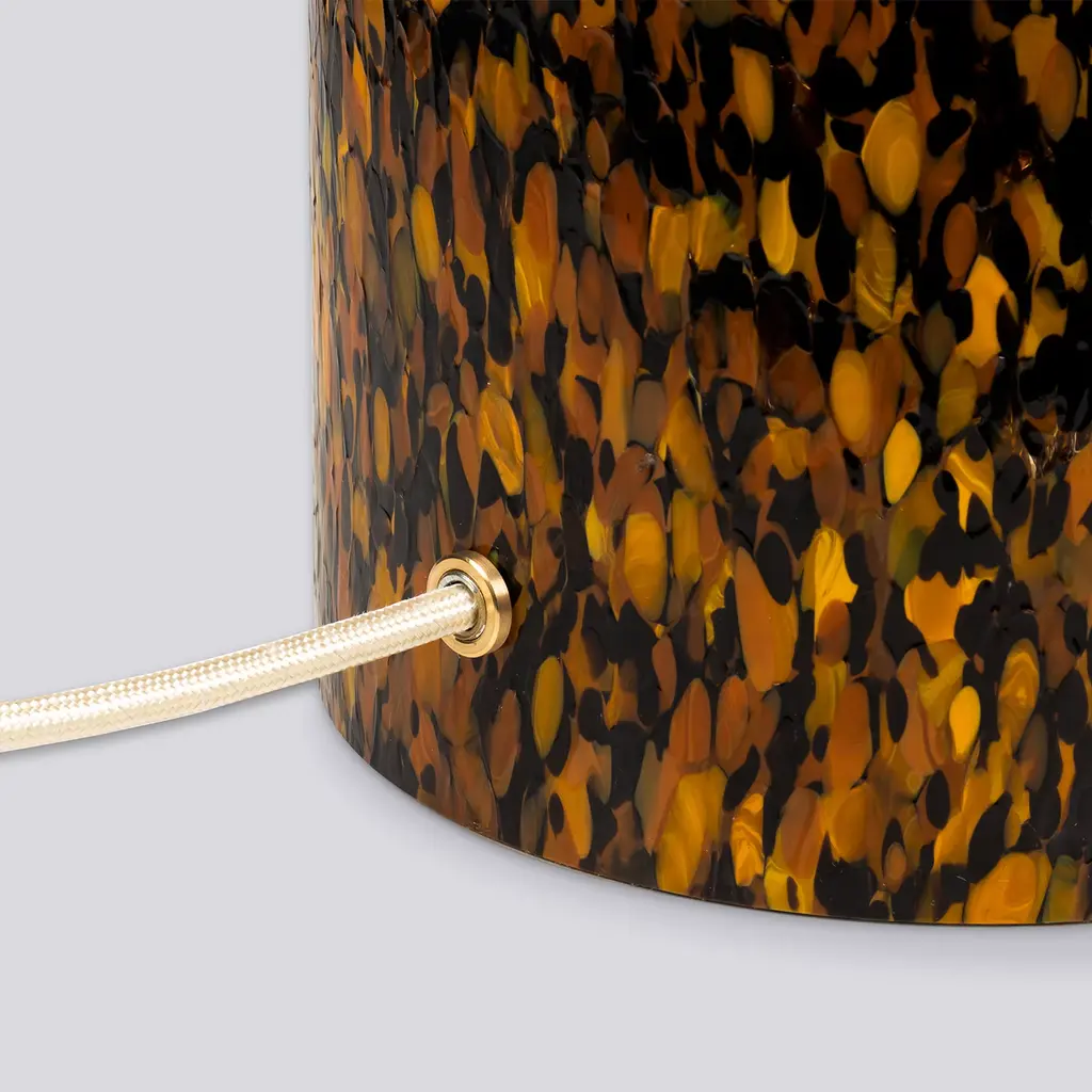 Exquisite Murano glass table lamp, a timeless and contemporary piece that combines elegance and craftsmanship. The lamp's base, crafted in a classical column shape, showcases the iconic "Macchia su Macchia" technique, known for its speckled glossy effect. Accompanied by a rope lampshade with a removable cover, this lamp offers both functionality and style. The brass finishing adds a touch of sophistication and luxury, while the fabric cord in a neutral color seamlessly complements the design.