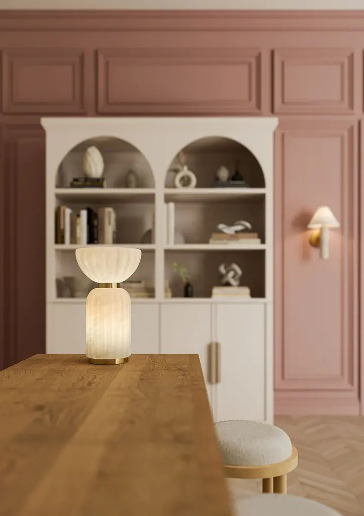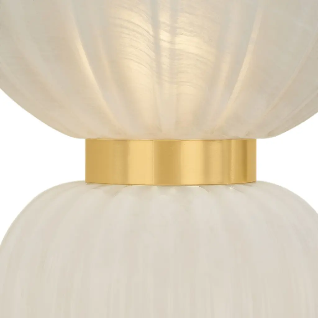 Leaning into the trend of updated neoclassical forms, the ethereal Leor lamp features a fluted, column-like base with an upturned dome shade. Milky striations in the cloud glass make an enchanting, contemporary statement, while the Aged Brass cuffs complement the antique feel of the design. As light emanates from the entirety of Leor, it creates an all-over glow that illuminates a desk or table.