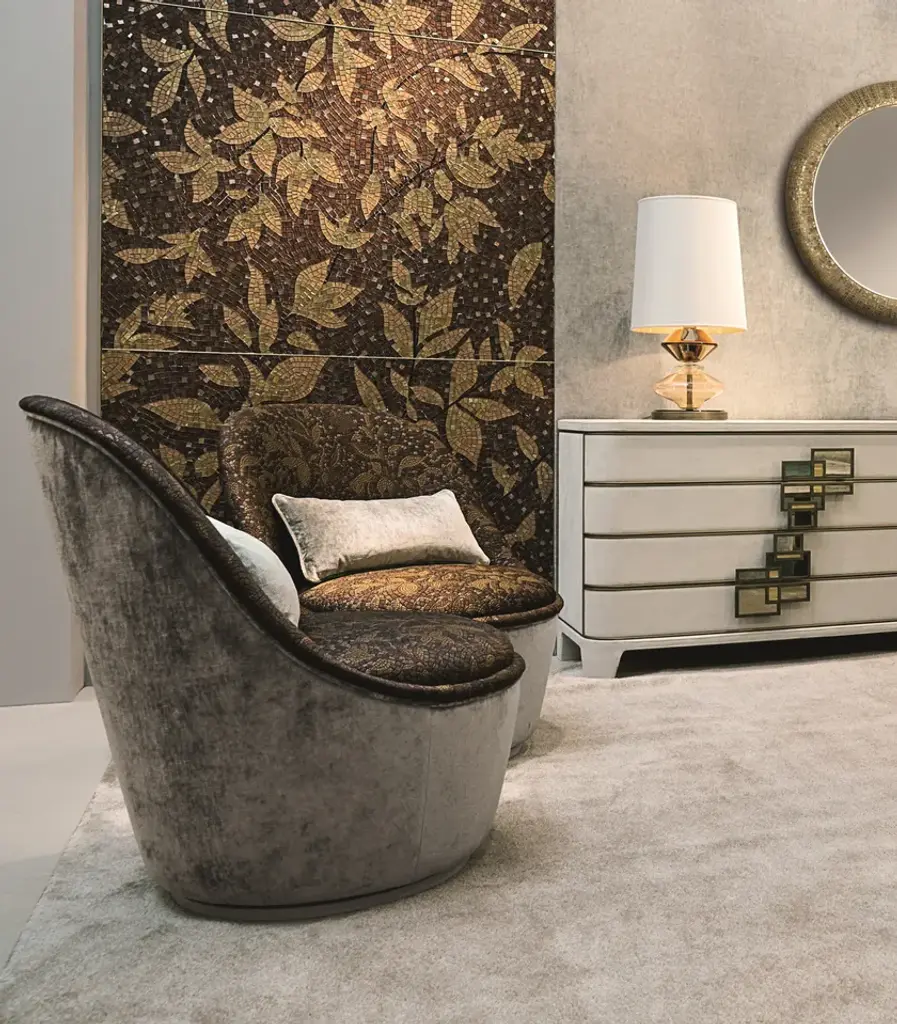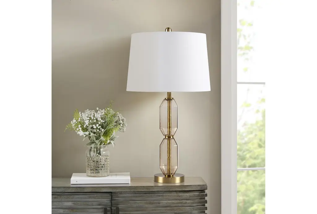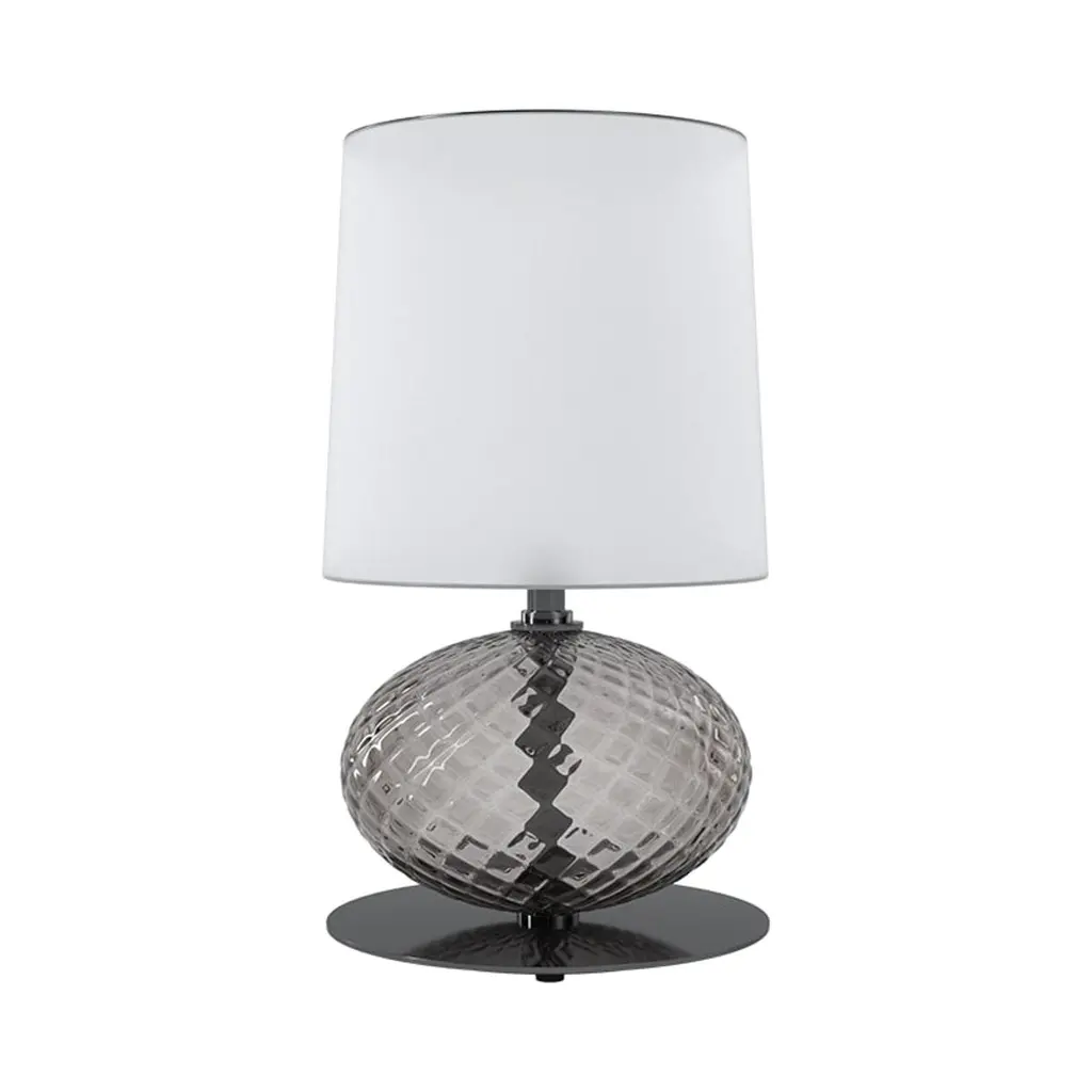 Lescot is a table lamp with bronzed metal structure, bronzed amber and pyrex glass or with chromed metal structure combined with smoky and chromed pyrex glass. A lampshade in ivory fabric on the outside and wrapped in bronze or silver on the inside.A new classicism born from a special combination of materials such as glass, metal, and other pure materials. A sophisticated and harmonious line, extremely contemporary.