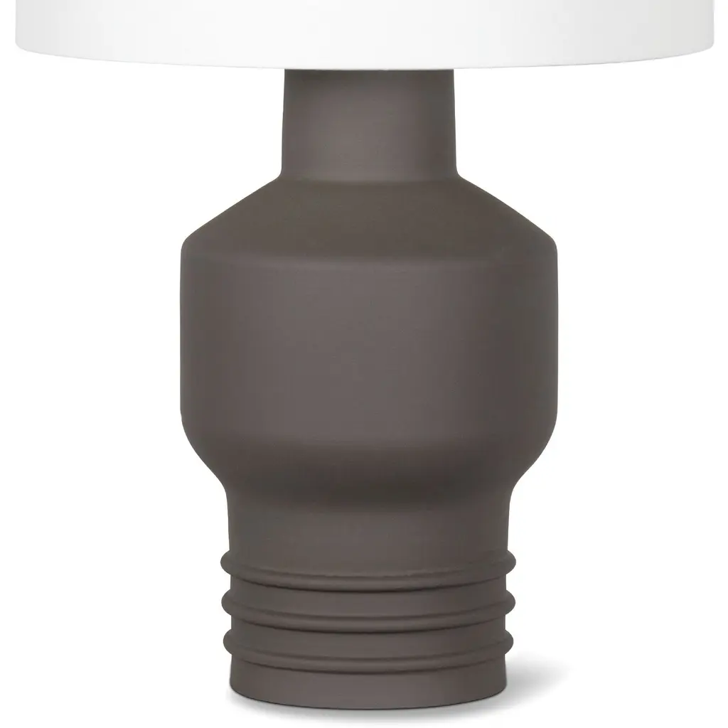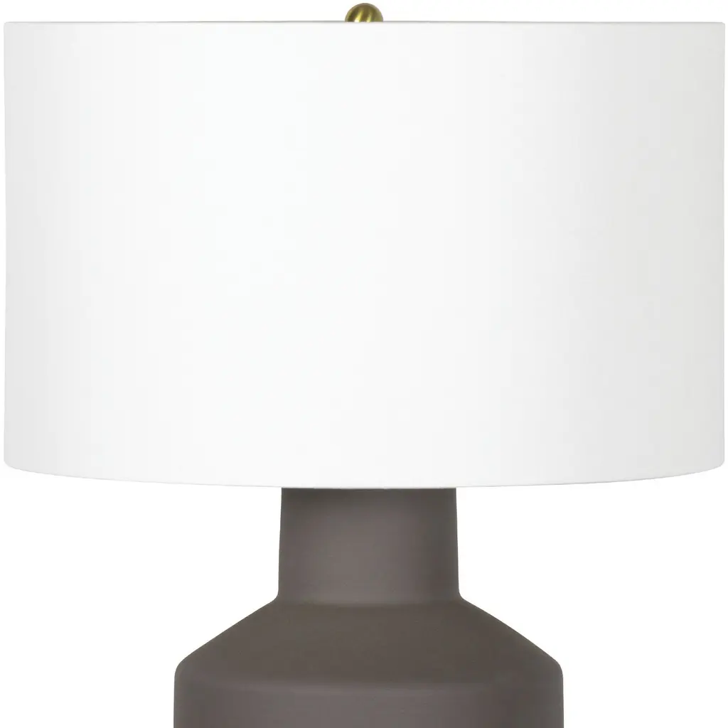 The matte dark brown-black finish and shape of the Lewis Ceramic Table Lamp underscores its commanding presence. The sculptural base combines the look of modern pottery with a solid color for a true statement piece.