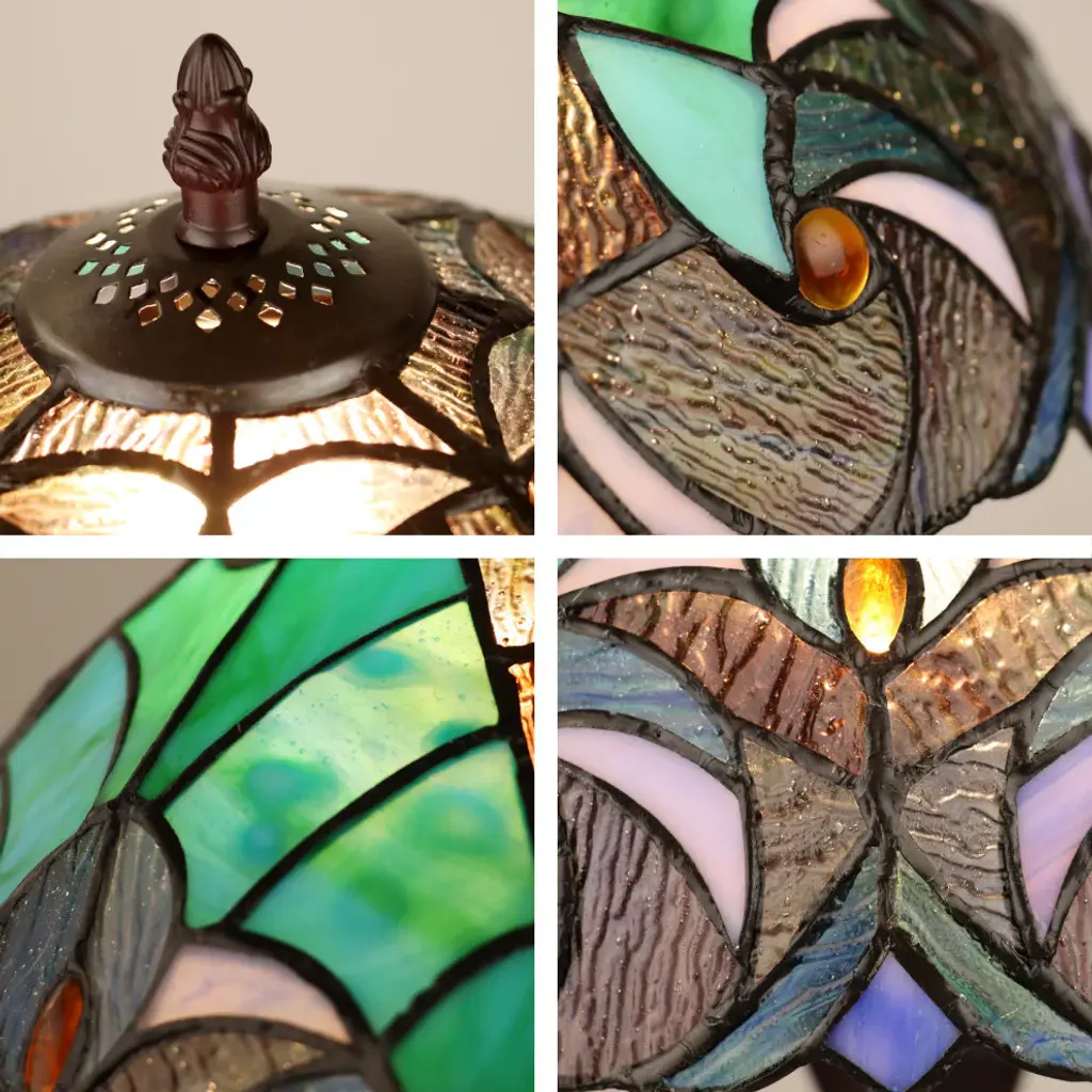Liaison is a pleasing, stained glass table lamp in a traditional Victorian style, featuring a detailed base and an on-cord rotary switch. This lamp would be perfect in a bedroom, living room, and dining room. The shade is hand-crafted, using the same methods developed by Louis Comfort Tiffany in the early 1900s. This process entails using 160 hand-cut stained art glass pieces and 12 glass beads, each wrapped in fine copper foil and soldered together at extremely high temperatures to form each unique piece. The exact size to the nearest inch may vary, and the exact color of each glass piece may vary due to each piece being hand-crafted. The first image is with the light shining through, and the second image is with no light. Dry-listed and recommended for an indoor setting.