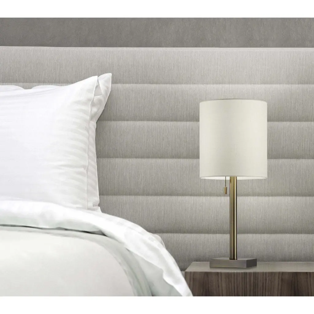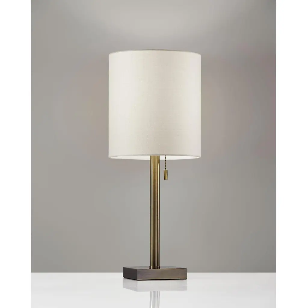 The Liam Table Lamp is an elegant style that highlights simple materials and a classic silhouette. A thick antique brass metal pole supports a light beige textured fabric shade. A tall cylinder shade is contrasted by a compact square shaped metal base. A simple pull chain turns the lamp on and off. A subtle clear cord trails out from the base. Set this table lamp on your nightstand for a soft, modern look.