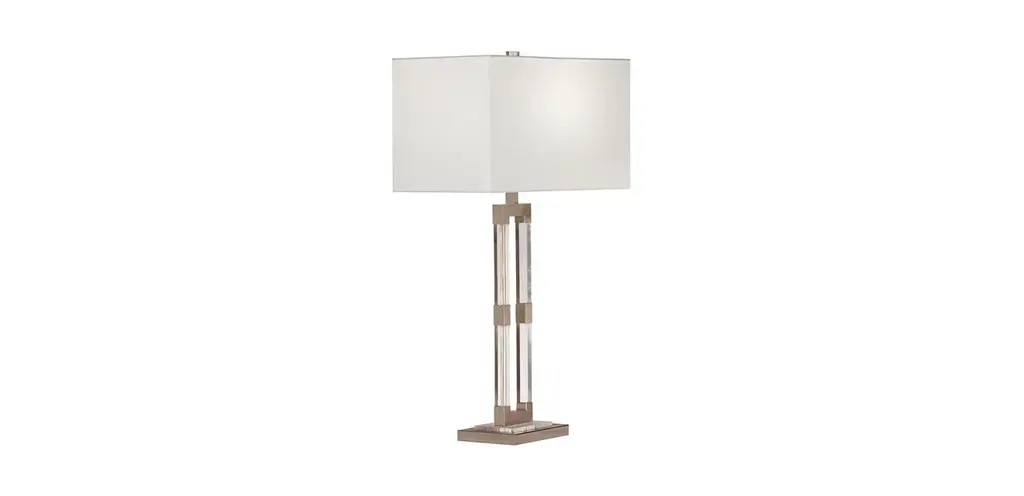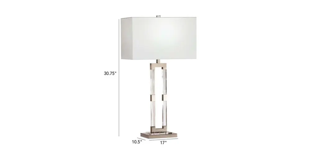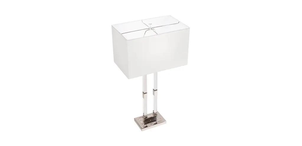 Simple, sleek, and versatile, Lydia is one of our favorite modern table lamps. Its slim, open rectangular base is crafted from clear acrylic and then accented with metal cuffs in a polished nickel finish for added depth and texture. With its modest scale and airy presence, Lydia works brilliantly both alone and in pairs, in any room.