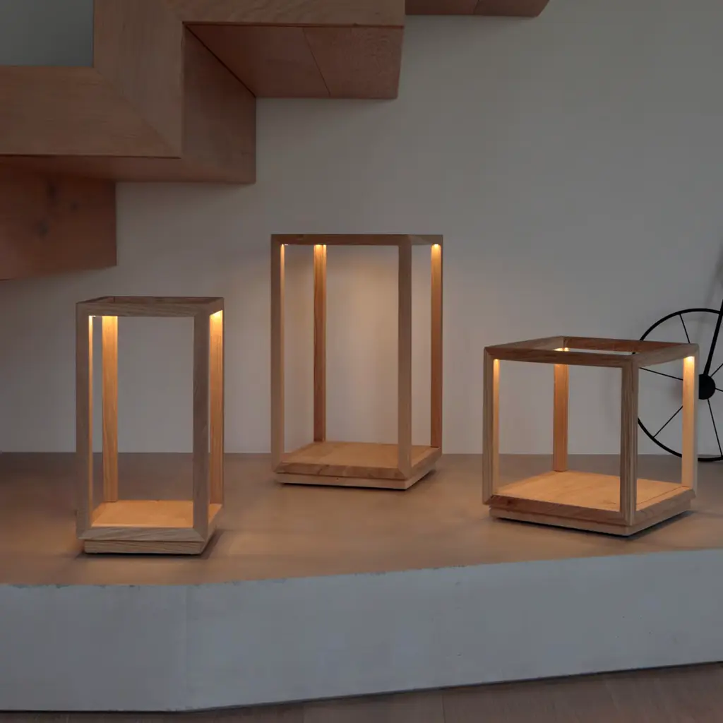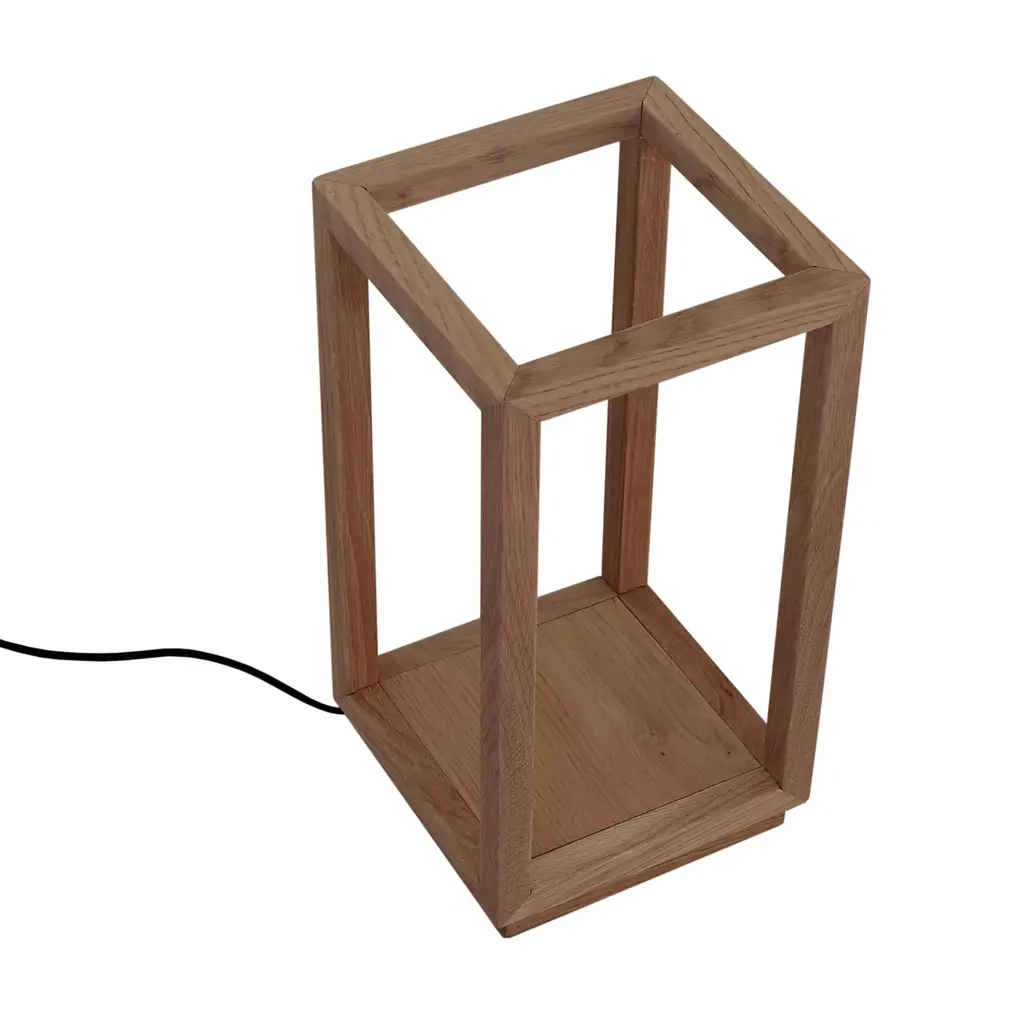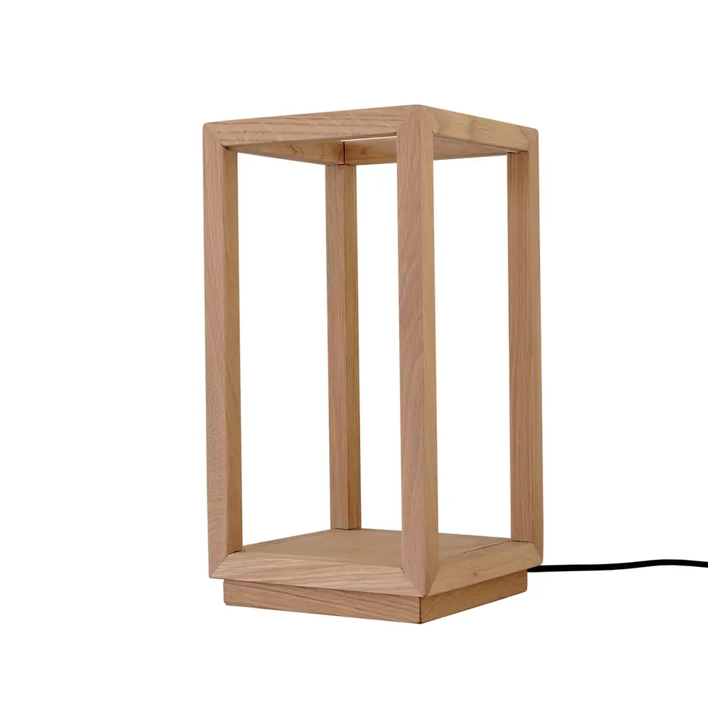 Distinguished by a parallelepiped whose geometric rigor is softened by a warm, dimmable glow of an LED strip, this table lamp will infuse tables with a relaxed feel. The utterly minimalist durmast structure is offered in its natural finish, characteristic revealing a clear reference to Scandinavian style. A larger and a cubic variant are also available, please consult the Artemest catalog for details.
