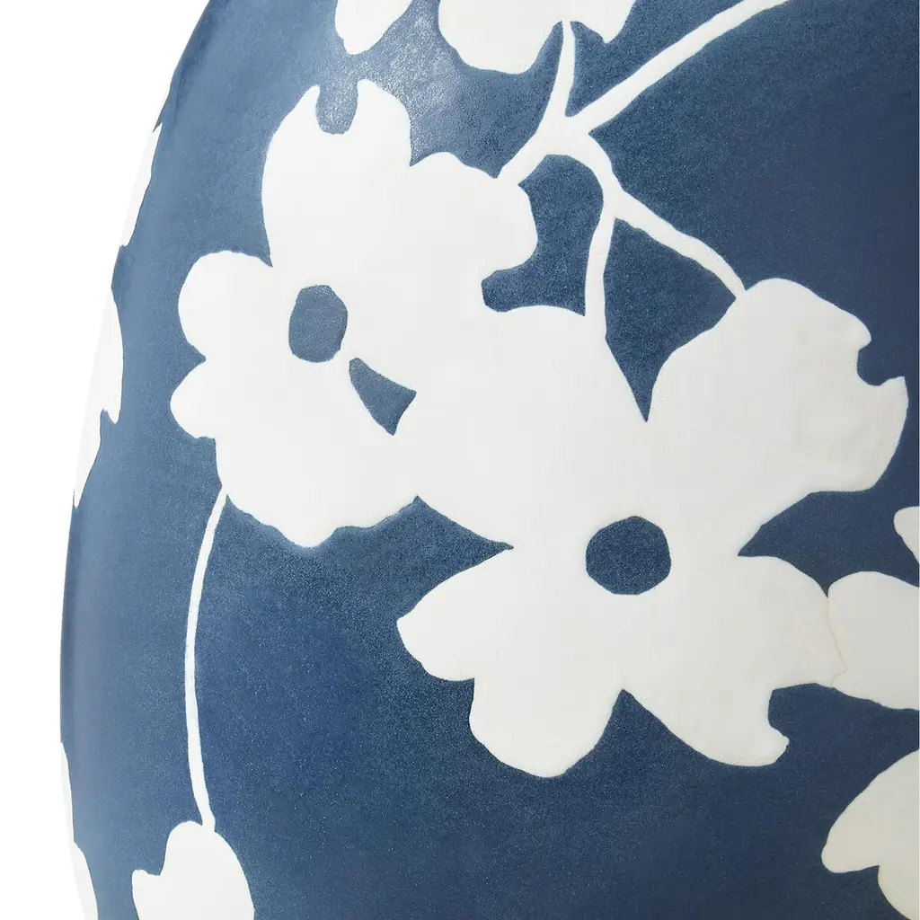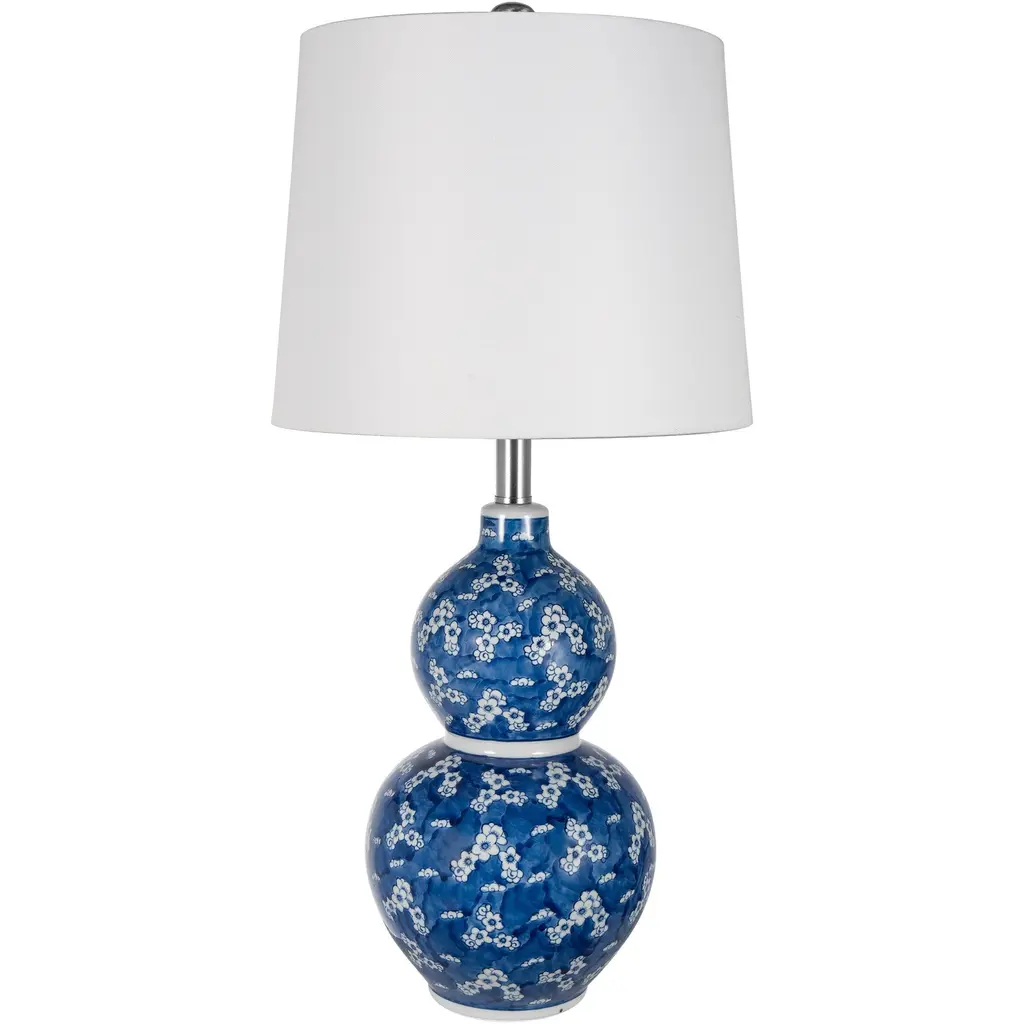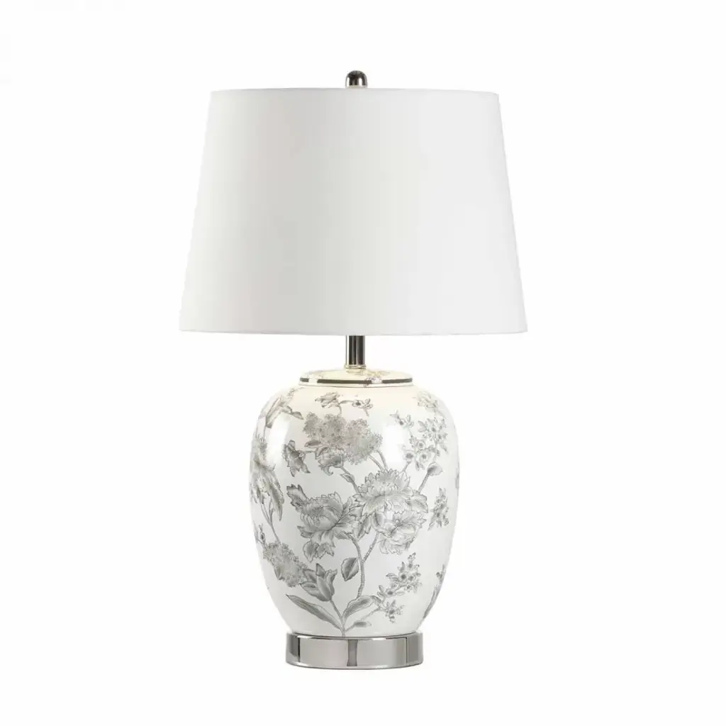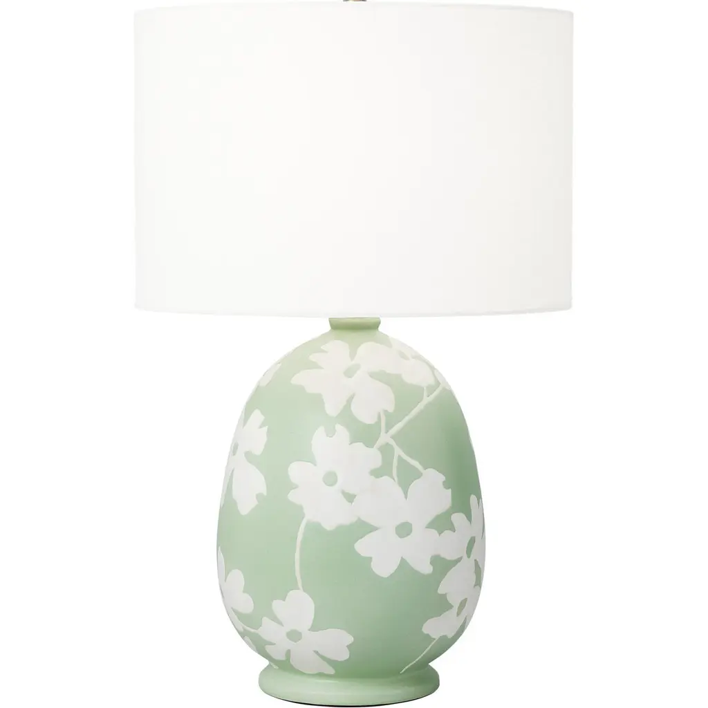 Flowering dogwood trees inspired the white blooms hand-painted on the ceramic body of this table lamp. The white linen drum shade complements the lamp's curves beautifully.