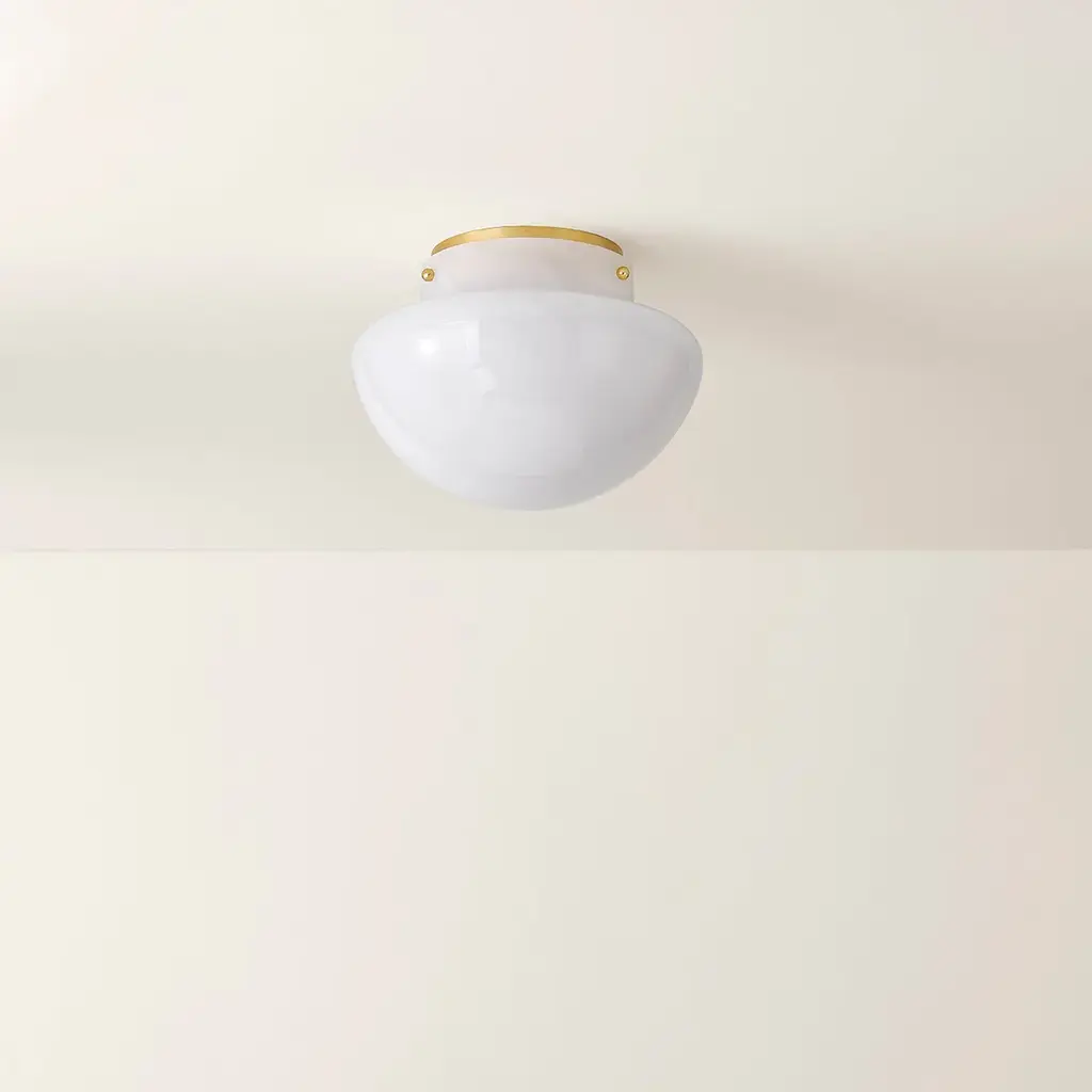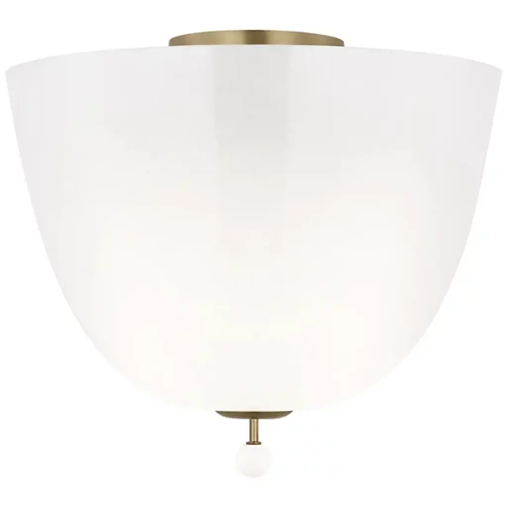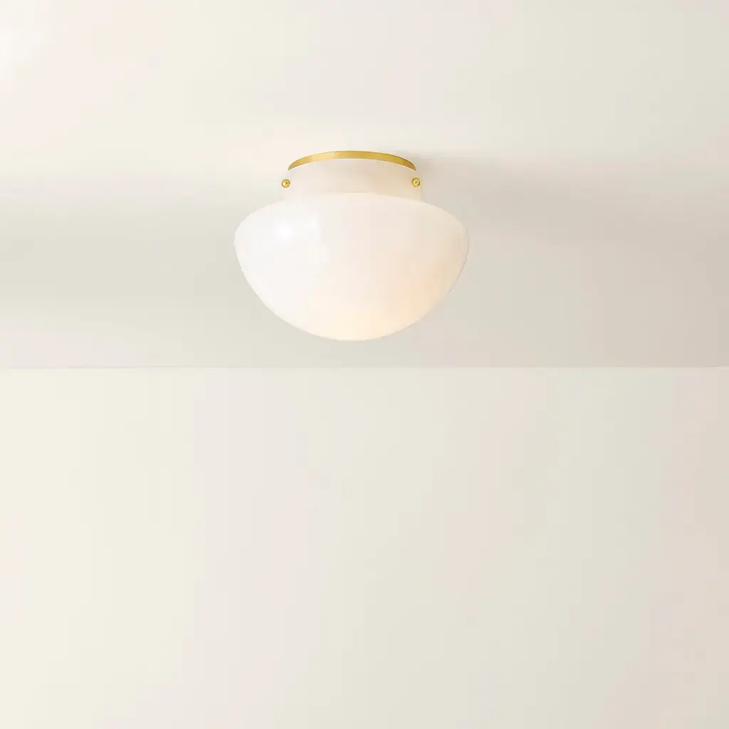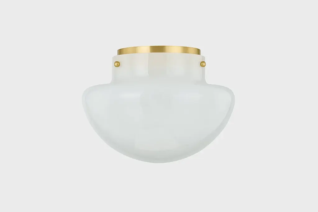 The stylish Lilou borrows features cloud glass and a mushroom-like shape, reminiscent of classic Murano glass table lamps to create a fixture full of vintage charm. An Aged Brass canopy and elegant thumb screws embellish the fixture. Emitting a soft glow, this flush mount makes a subtle statement without taking up a lot of space.