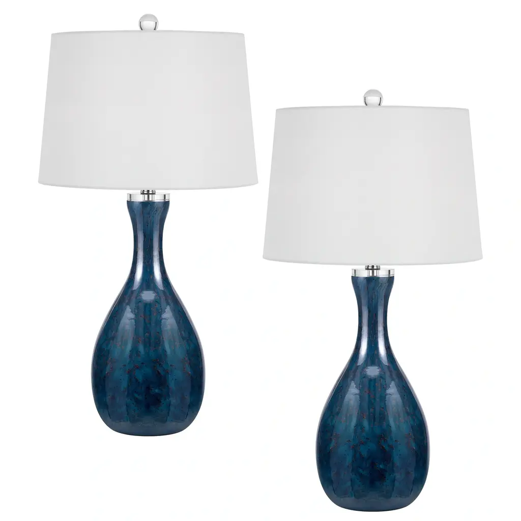 Add a pop of color to your space with this wide bottom glass table lamp. It features a vibrant deep blue finish with colored accent specs. This lamp is sold as a pair and ships complete with matching shades and finials.