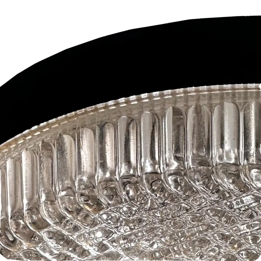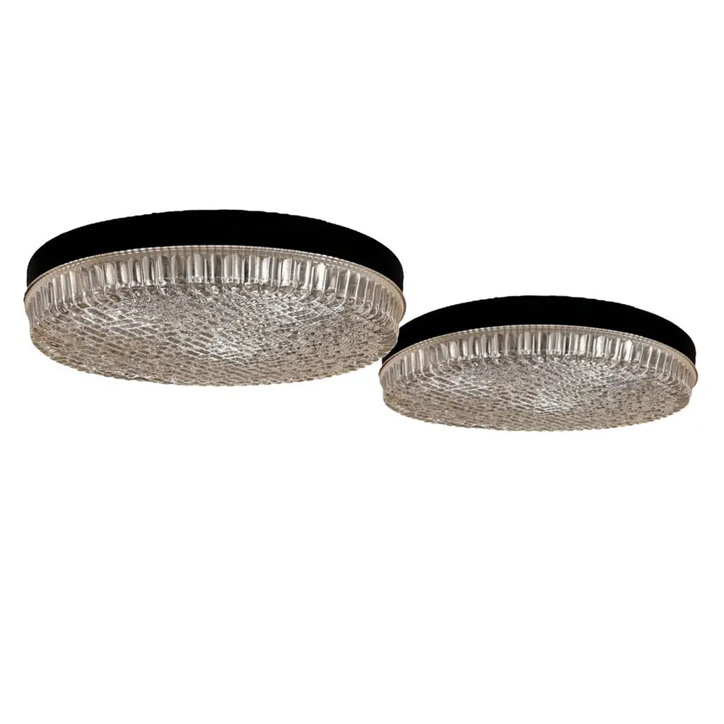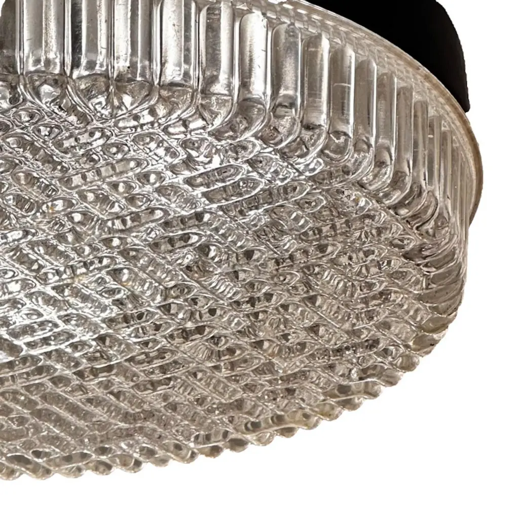 Attributed to Germany's top lighting manufacturer, Glasshutte Limburg and remeniscent of lighting designed by Helena Tynell, these flush mounts feature a unique bubble glass lense consisting of small round and capsule shaped bubbles that create a maze like pattern when viewed from a distance. Equally sized baguette shaped vertical bubbles run the perimeter of the glass. Three lamps are housed within the blackened steel body. Each fixture is priced and sold individually.