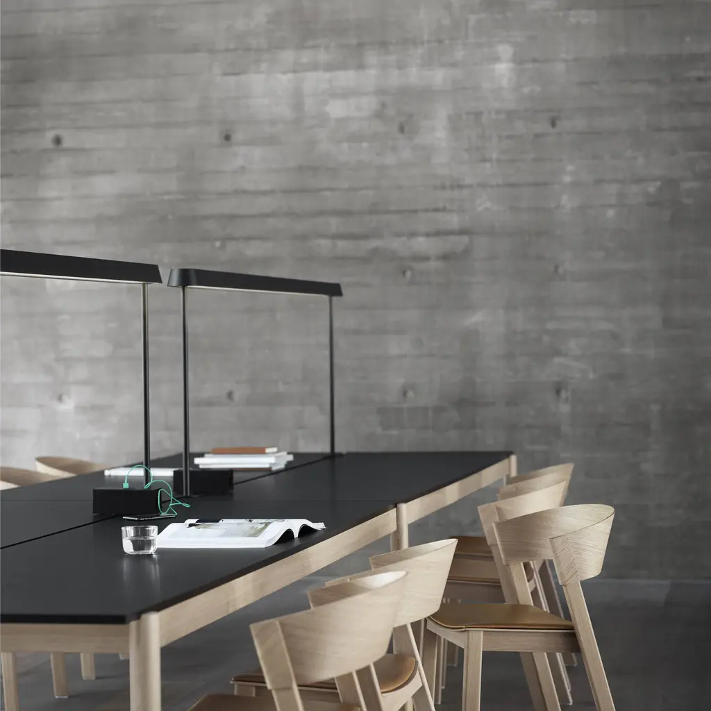 From Muuto's workaday Linear array, designer Thomas Bentzen's accompanying mounted longer table lamp brings added flexibility to the system's customizable configurations. Conceived with inherent functionality via its dimmable integrated LED light source, it also hints at the archetypal library lamp through its familiar form. The compact dimensions also help lend a sense of intimacy to larger spaces—along with an appealing character that allows for the lighting to be used in nearly any setting.