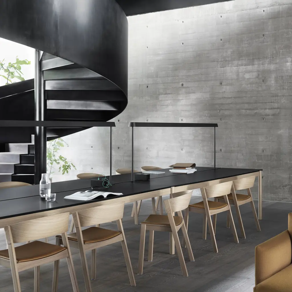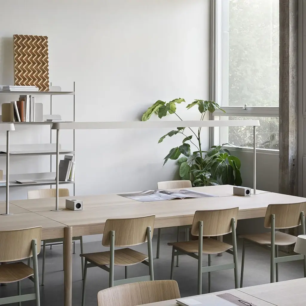 From Muuto's workaday Linear array, designer Thomas Bentzen's accompanying mounted longer table lamp brings added flexibility to the system's customizable configurations. Conceived with inherent functionality via its dimmable integrated LED light source, it also hints at the archetypal library lamp through its familiar form. The compact dimensions also help lend a sense of intimacy to larger spaces—along with an appealing character that allows for the lighting to be used in nearly any setting.