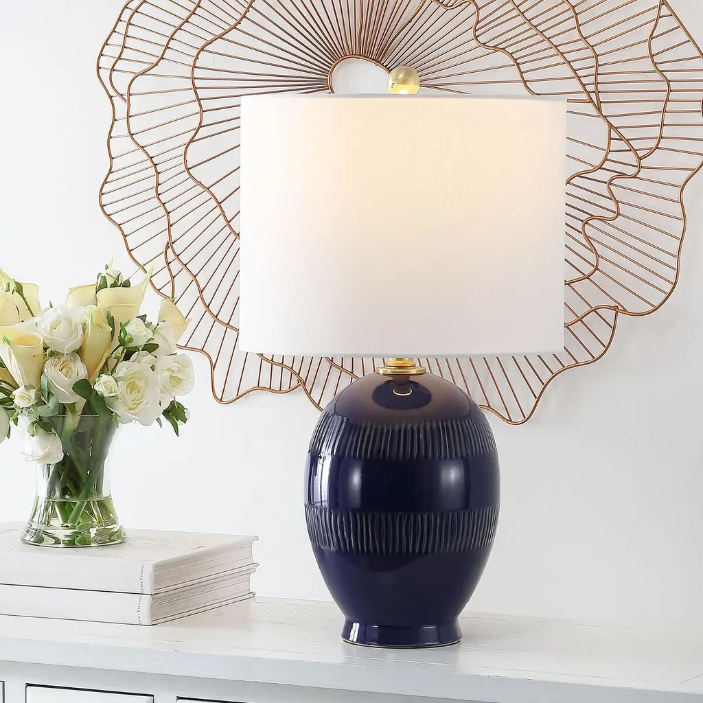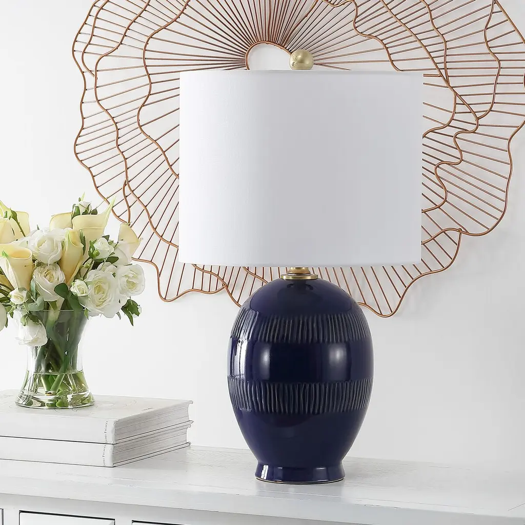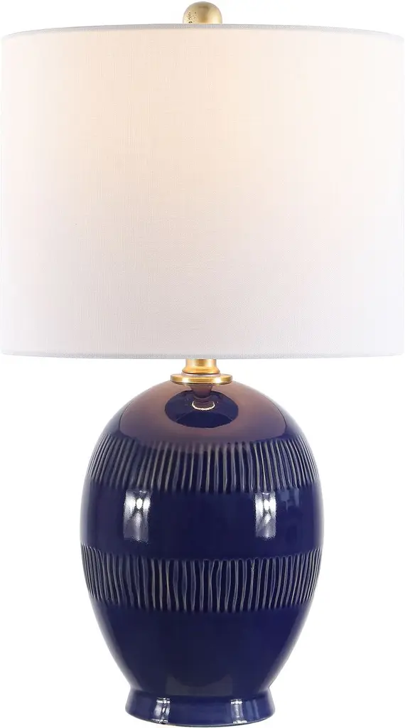 Bands of linear detailing accentuate the lustrous blue finish and graceful curves of this table lamp's ceramic body. The snowy cotton shade is a suitably elegant finishing touch.