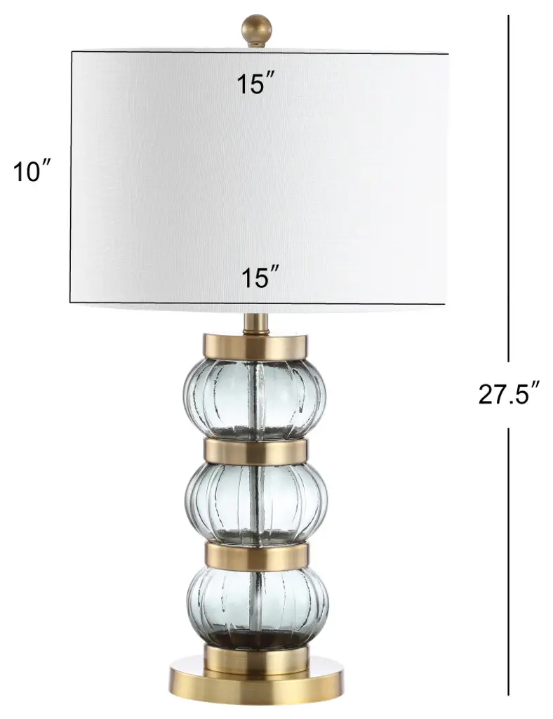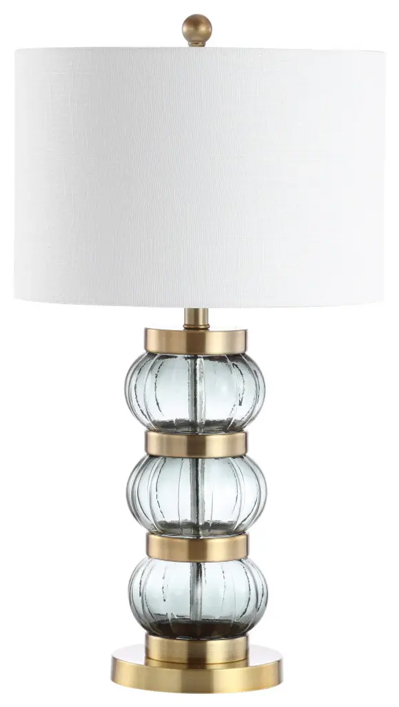 A trio of smoked glass spheres are elegantly stacked between brass plates in this contemporary show stopper. At nearly 28" high, it makes a statement in stature, as well as design. And completed with designer details such as a matching finial and silk wrapped cord -- this is sure to become a future heirloom. Features:• The lampshade is created with hardback construction to reduce the likelihood of dents, and finished in a cotton fabric• On-off rotary switch on socket• Eco-friendly 9W LED bulb included• Takes one bulb and compatible with any 12W LED or 100W TYPE "A" or 23W CFL• UL Listed • 0• Color: Smoked grey with white shade• Body Material: Glass/Metal• Base Material: Metal• Finial Material: Metal• Finial Color: Brass Gold• Harp Color: Gold• Includes: One (1) lamp(s)• Minor Assembly RequiredDimensions:• Lamp: 27.5 inches high x 15 inches wide x 15 inches deep• Shade: 10 inches high x 15 inches wide x 15 inches deepAbout us:You see a lamp.We see a decorative work of art.A perfectly curved shade casts a dramatic shadow on a floor. A silk cord you never want to hide. LED lightbulbs: as easy on the environment as they are on the eyes. The JONATHAN Y Lighting collection considers every detail from impeccably sourced materials to designer styling. And our prices are so attractive, we''ve transformed a functional necessity into a fashion accessory.JONATHAN Y Lighting - a fashion revolution in home decor.