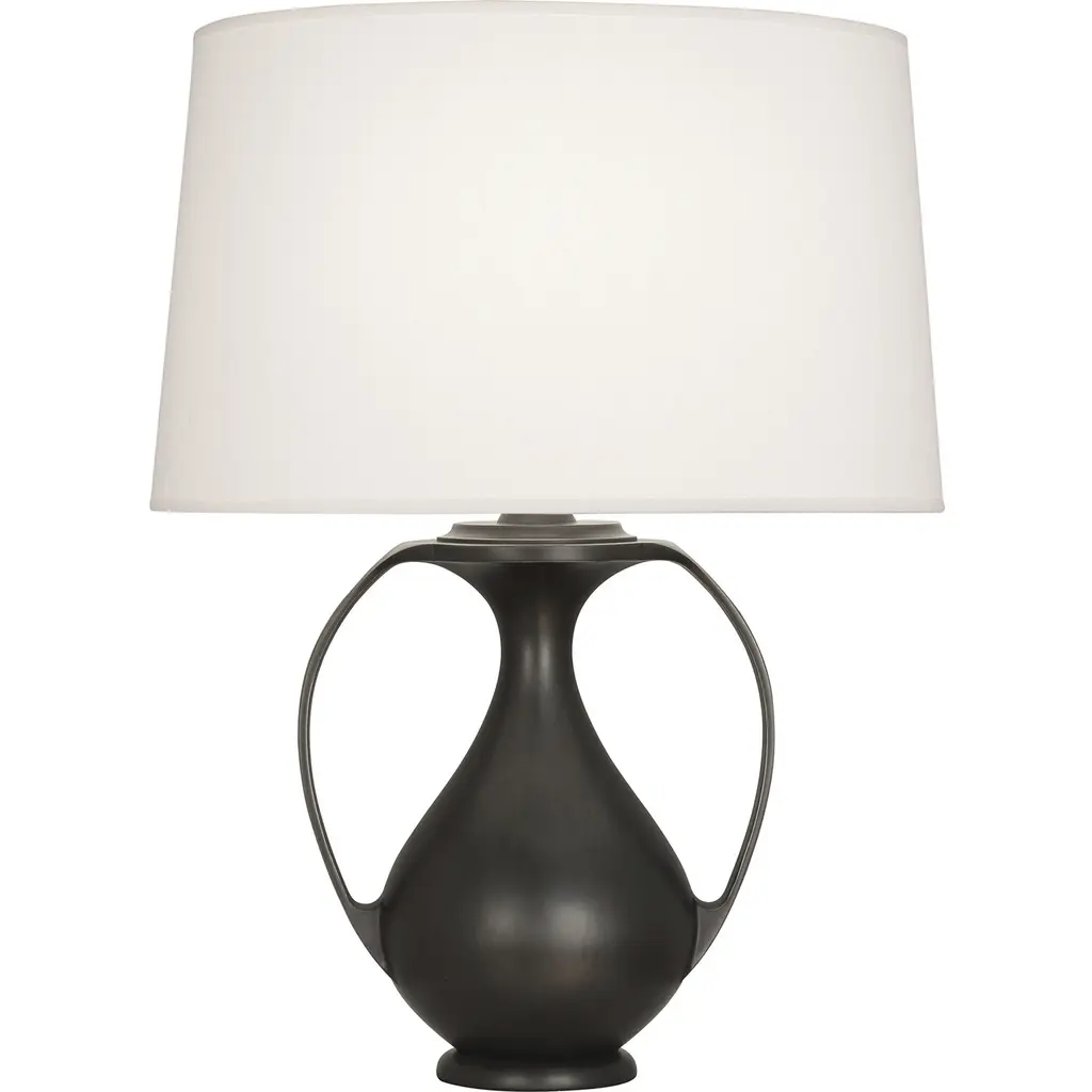 With curves in all the right places, the Hubbardton Forge Lino Table Lamp lends subtly organic flair to a traditional shape. The open metalwork on Lino's hand-forged wrought iron base is at once airy and substantial. Atop the bulb-shaped base, a gently flared, smooth fabric shade creates a welcome contrast to the roughly finished metal.