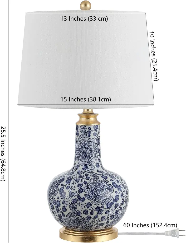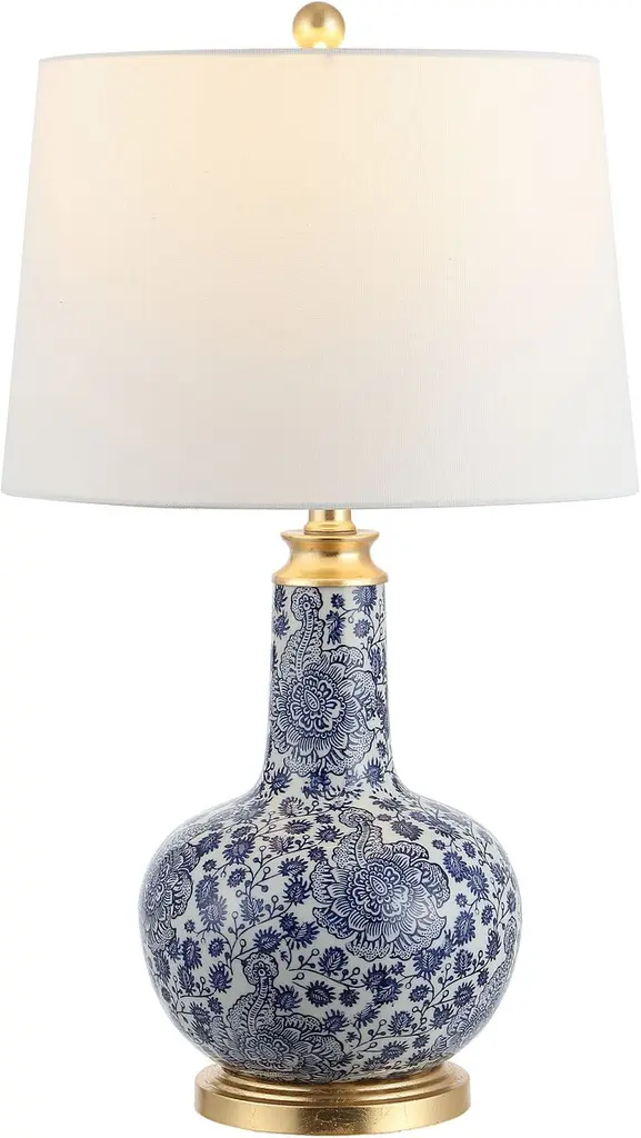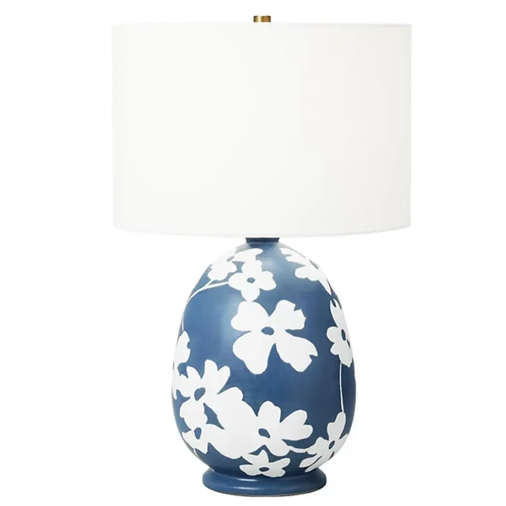 The detailed floral motif painted on the ceramic body makes this table lamp an artful addition to a room. The golden base and finial provide timeless elegance, as does the cotton shade.