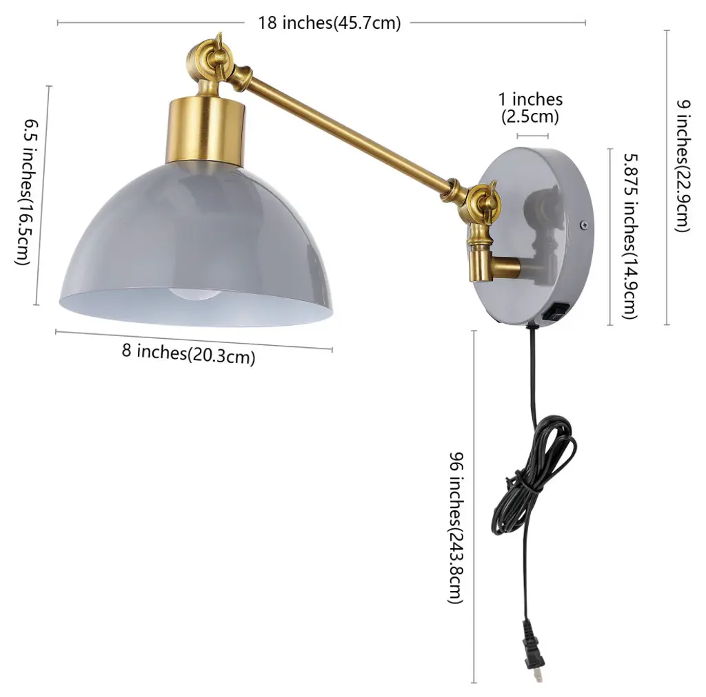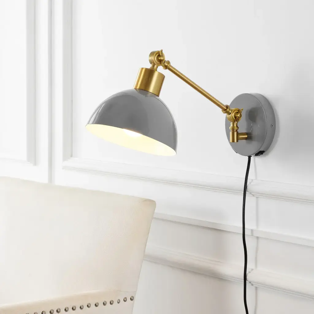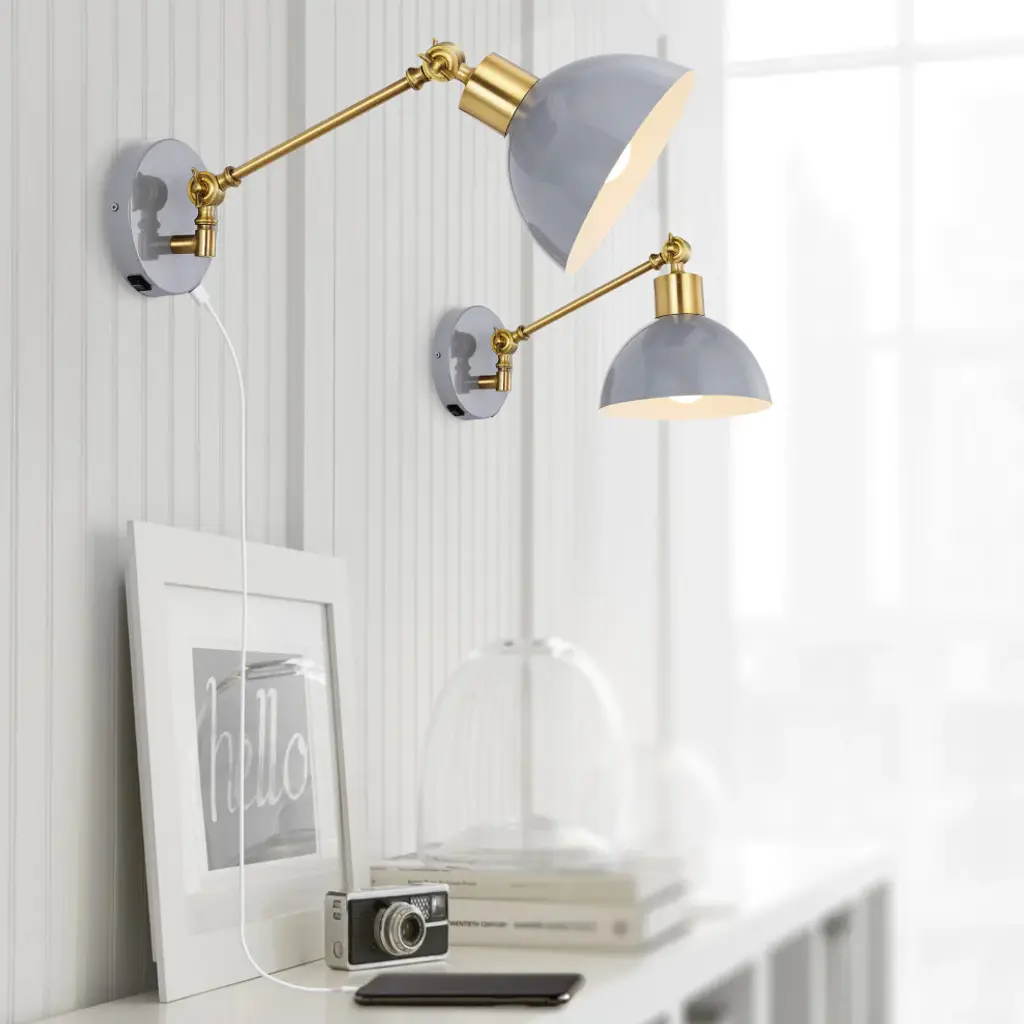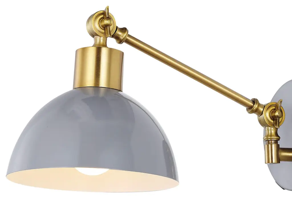 Upgrade your bedroom''s style with our adjustable-height gray wall light. Brass-gold fittings add a touch of warmth, and a handy USB outlet makes bedside charging easy. A pair of these wall lights is the perfect solution for a small master bedroom, kids room, guest room or home office - they''re great for hospitality projects too.-This wall light''s timeless design is perfect for modern and traditional interiors, especially guest rooms and resort rentals-Quality touches include a metal shade, adjustable arm, USB charging port and an elegant silk-wrapped cord-Takes 1 bulb and compatible with 9W LED or 60W TYPE "A" or 13W CFL-Eco-friendly 9W LED bulb included-Takes 1 bulb and compatible with TYPE "A" 60W or CFL 13W or LED 9W-Color Temperature: 2700K-CRI: 80-Color: Brass Gold with grey shade-Body Material: Metal-----Includes: One (1) lamp-Assembly Required-Lamp: 9 inches high x 8 inches wide x 18 inches deep-Shade: 4.5 inches high x 8 inches wide x 8 inches deepYou see a lamp.We see a decorative work of art.A perfectly curved shade casts a dramatic shadow on a floor. Compatible with LED lightbulbs: as easy on the environment as they are on the eyes. The JONATHAN Y Lighting collection considers every detail from impeccably sourced materials to designer styling. And our prices are so attractive, we''ve transformed a functional necessity into a fashion accessory.JONATHAN Y Lighting - a fashion revolution in home decor.