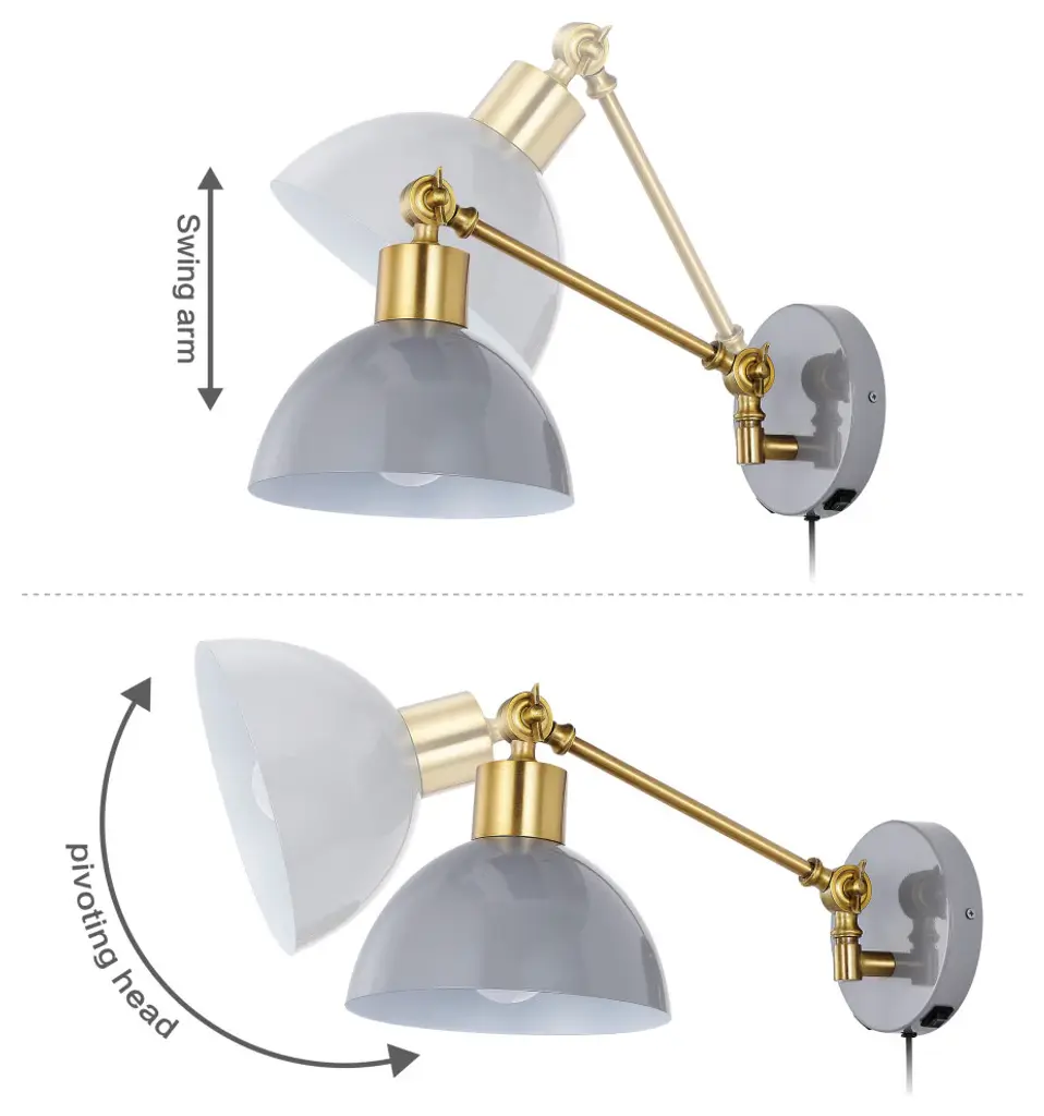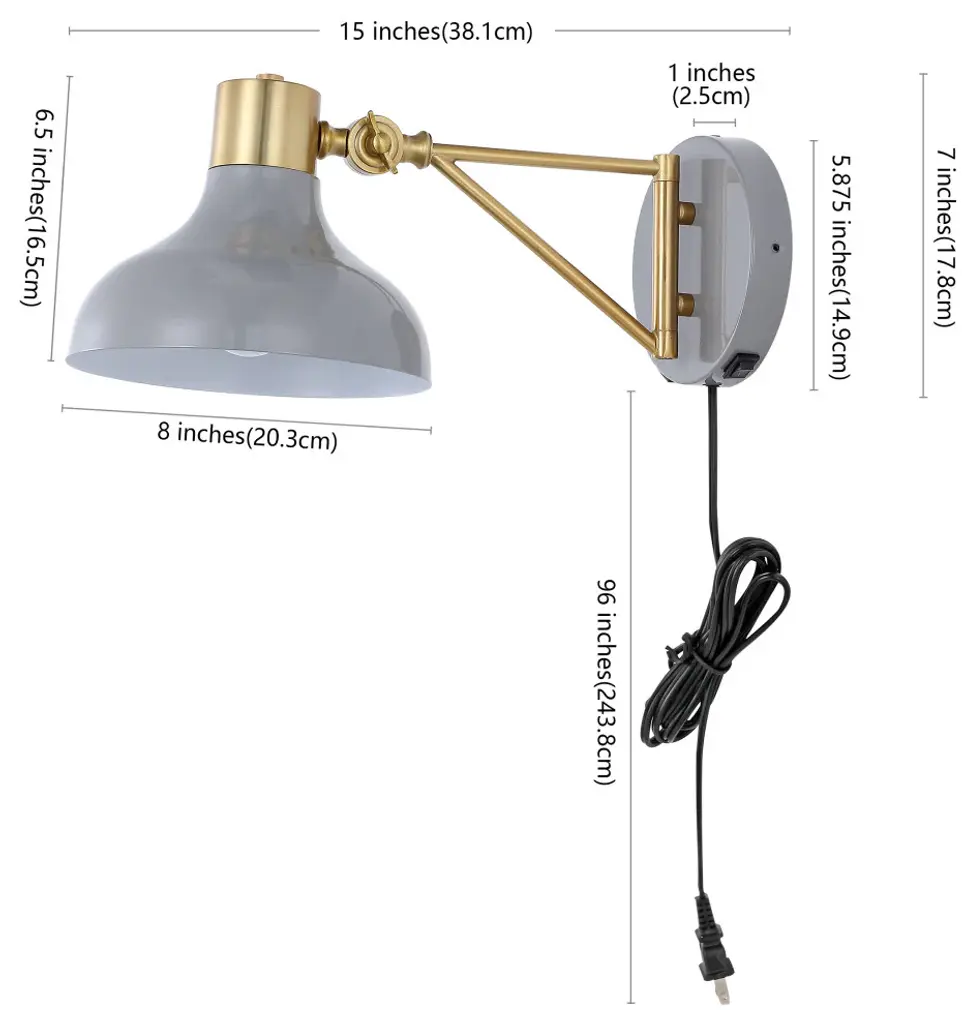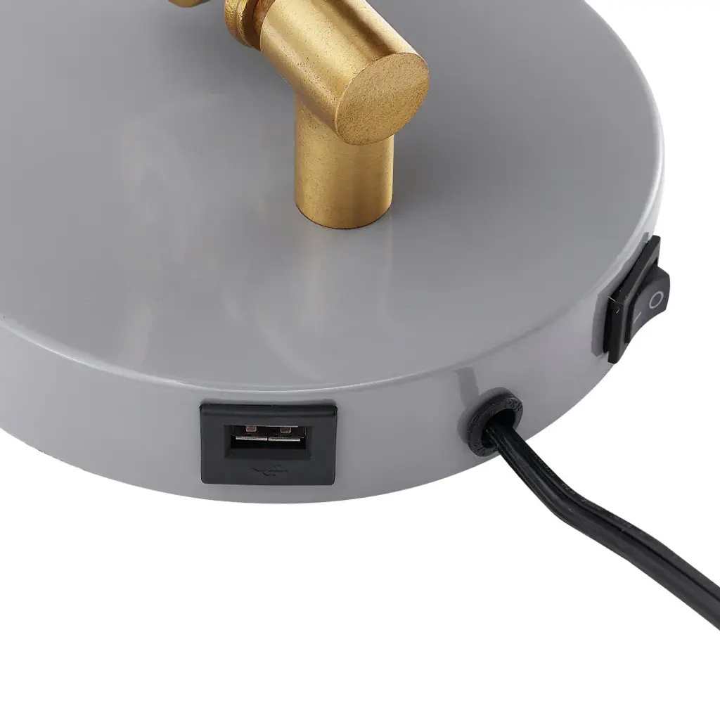 Upgrade your bedroom''s style with our adjustable-height gray wall light. Brass-gold fittings add a touch of warmth, and a handy USB outlet makes bedside charging easy. A pair of these wall lights is the perfect solution for a small master bedroom, kids room, guest room or home office - they''re great for hospitality projects too.-This wall light''s timeless design is perfect for modern and traditional interiors, especially guest rooms and resort rentals-Quality touches include a metal shade, adjustable arm, USB charging port and an elegant silk-wrapped cord-Takes 1 bulb and compatible with 9W LED or 60W TYPE "A" or 13W CFL-Eco-friendly 9W LED bulb included-Takes 1 bulb and compatible with TYPE "A" 60W or CFL 13W or LED 9W-Color Temperature: 2700K-CRI: 80-Color: Brass Gold with grey shade-Body Material: Metal-----Includes: One (1) lamp-Assembly Required-Lamp: 9 inches high x 8 inches wide x 18 inches deep-Shade: 4.5 inches high x 8 inches wide x 8 inches deepYou see a lamp.We see a decorative work of art.A perfectly curved shade casts a dramatic shadow on a floor. Compatible with LED lightbulbs: as easy on the environment as they are on the eyes. The JONATHAN Y Lighting collection considers every detail from impeccably sourced materials to designer styling. And our prices are so attractive, we''ve transformed a functional necessity into a fashion accessory.JONATHAN Y Lighting - a fashion revolution in home decor.