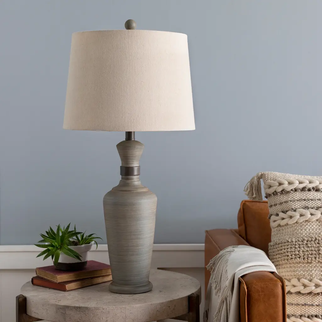 The Constance table lamp is a great neutral lighting piece to incorporate into your home decor style. Its gray, hand-finished composition base and natural linen shade in a unique shape makes it perfect for mixing with multiple lifestyles. Standing at 28.5 inches, this table lamp can be easily styled in multiple rooms. Wipe clean with a dry cloth.Features:3-Way Switch