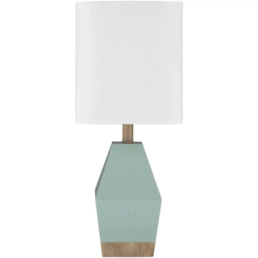 Featuring a simple geometric shape with a lovely aqua and wood tone finish, the Ellinor lamp will be a great addition to your home. Also featuring a crisp white linen shade, this lamp will blend seamlessly with many different styles. Standing at 17.37 inches high, this petite lamp is perfect for a small bedside table or in a sweet nursery. Wipe clean with a dry cloth.