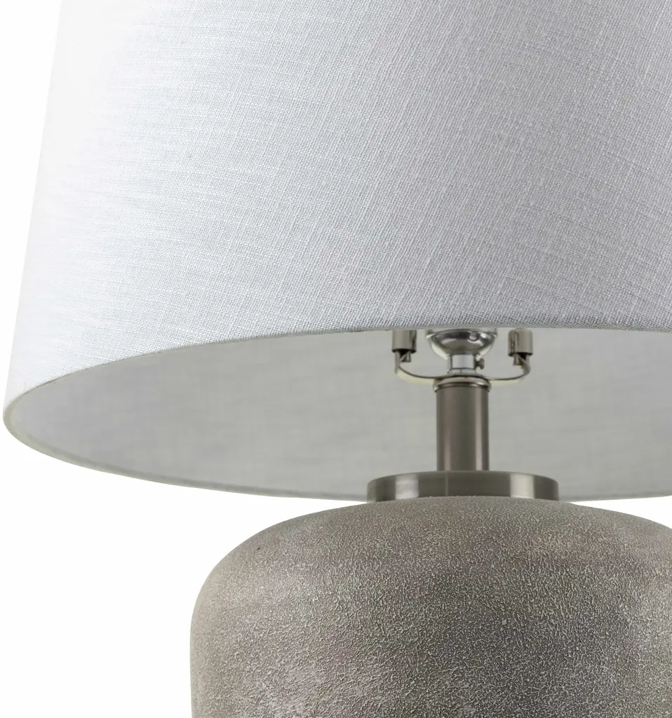 Collection: Chilecito Colors: Light Gray, White, Metallic - Nickel, Translucent Material: Body: Resin / Shade (Outside): Linen / Shade (Inside): Polyester / Finial: Iron Styles: Traditional Made In: China Lighting Type: Accent Table Lighting Shade Material: Linen, Polyester Shade Color: White, White Cord Length: 6' Switch Type: 3-Way Number of Bulbs: 1 Socket Type: E-26 Bulb Wattage: 100W