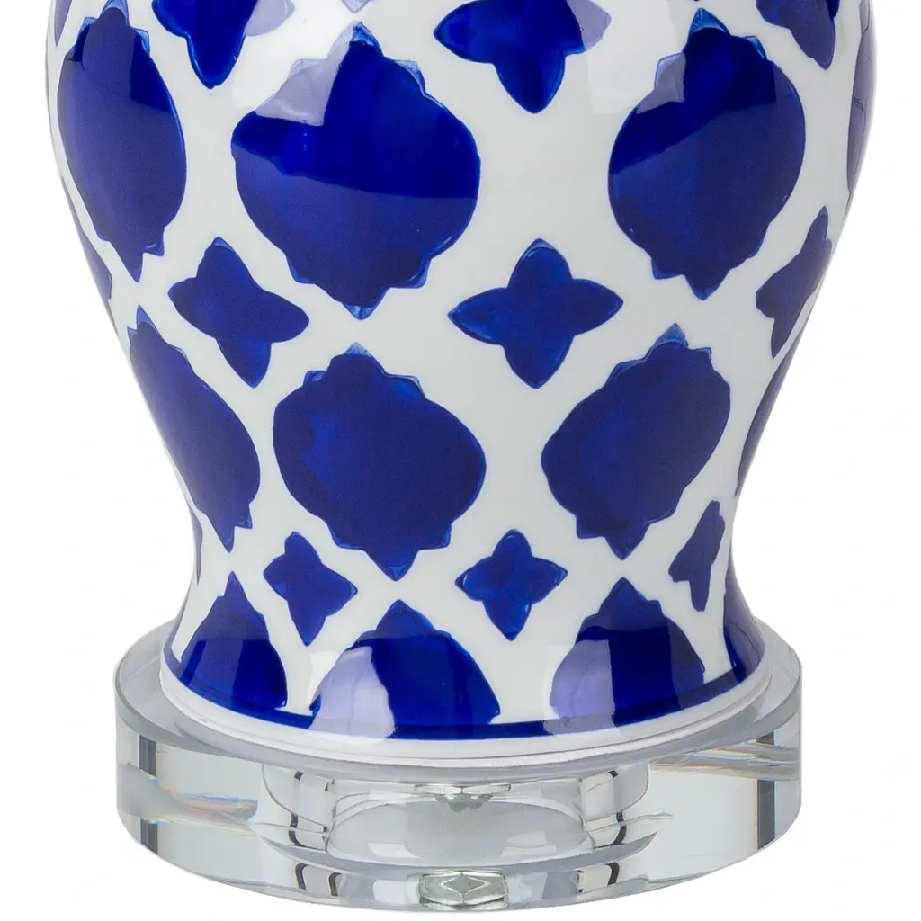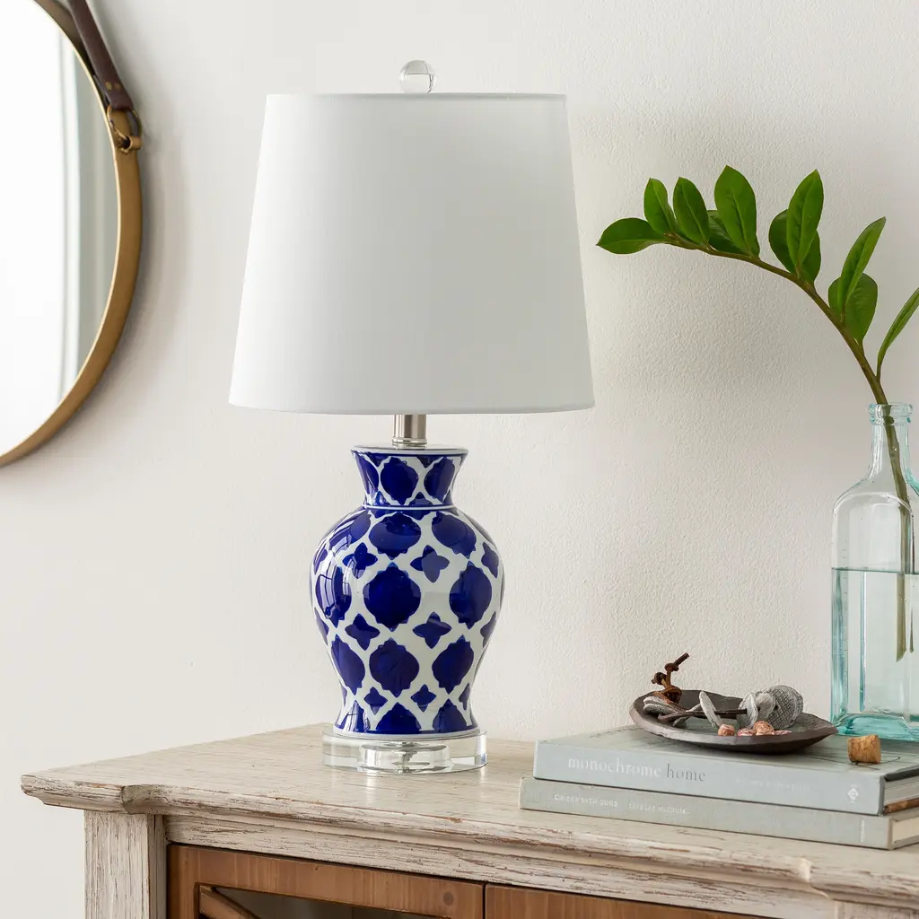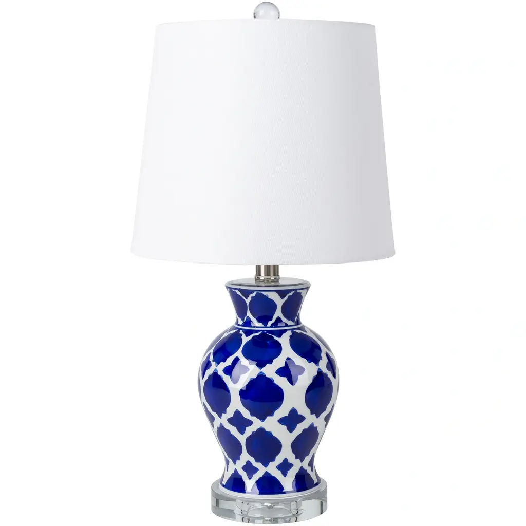 Captivating curves and geometric shapes make the Zanna Traditional Blue Ceramic Table Lamp a sophisticated choice for today's interiors. Designed with a blue and white pattern on its glazed ceramic body, the lamp sets on a translucent crystal base and is topped with a glamorous white linen shade. Crafted in China. Overall Dimensions: 21"H x 11"W x 11"D. Wipe with a clean cloth.