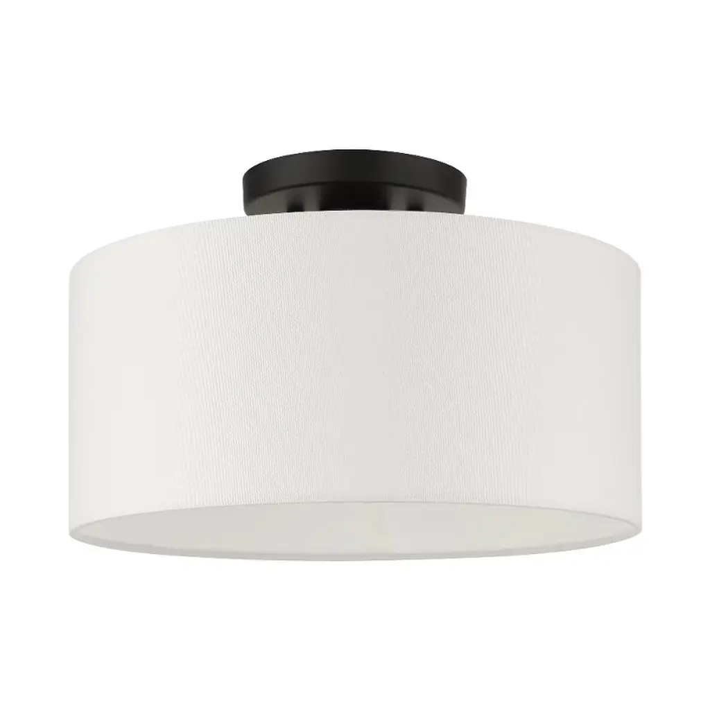 Collection: Meridian, Material: Steel, Finish Color: Black, Width: 13", Height: 8.5", Lamping Type: Incandescent, Number Of Bulbs: 1, Wattage: 60 Watts, Moisture Rating: Dry Rated, Desc: The Meridian collection has a clean, crisp look and contemporary appeal. The hand-crafted off-white fabric hardback shade offers a diffused warm light. This medium single-light drum shade adds character to this handsomely styled semi flush mount. Will adapt well in the hallway, bathroom, kitchen, small bedroom or by an entrance tastefully elevating your style. This sleek design is shown in a black finish. Canopy Included: Yes / Shade Included: Yes / Canopy Diameter: 5.13 x 0.75. ,