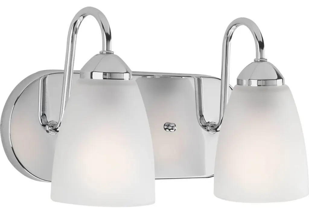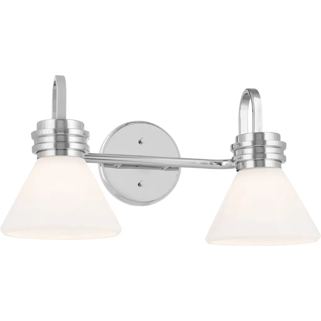 Collection: Somerville, Material: Steel, Finish Color: Polished Chrome, Width: 15.25", Height: 7", Depth: 7.5", Height From Outlet Box: 3.5", Backplate Width: 5.5", Backplate Length: 5.5", Lamping Type: Incandescent, Number Of Bulbs: 2, Wattage: 100 Watts, Moisture Rating: Dry Rated, Desc: The hand blown satin opal white shades extend from gently curved arms reaching from the round backplate and are finished with small, orb finials at both ends to reinforce the curvaceous motif.,