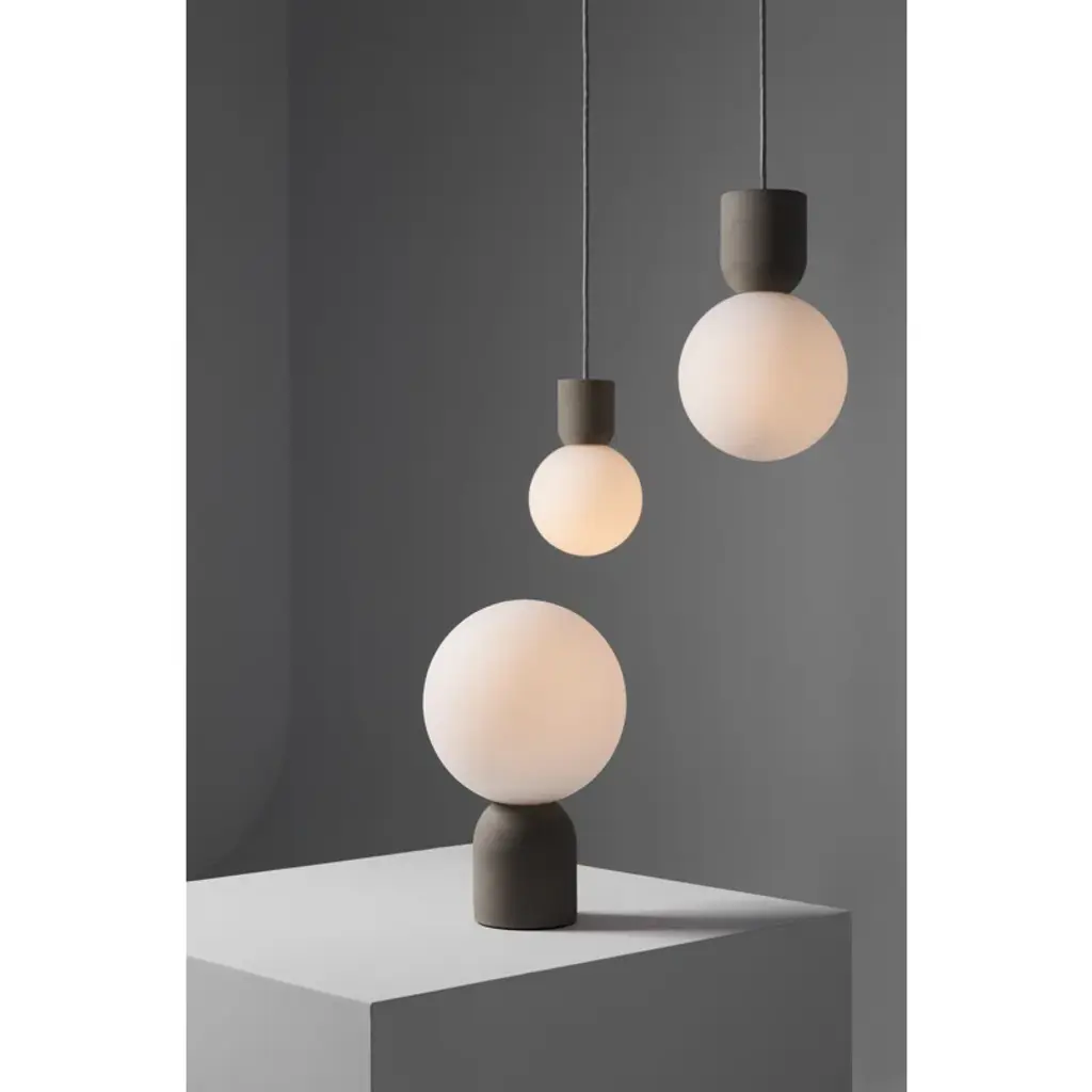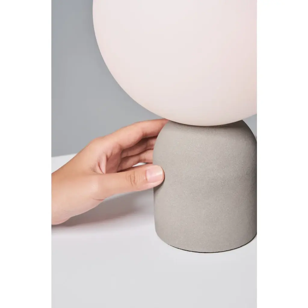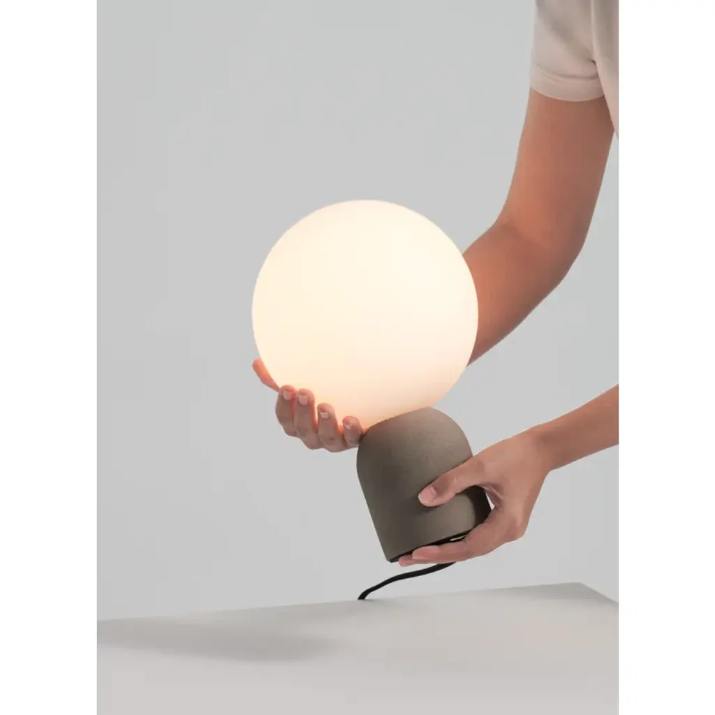 Concrete chic. This table lamp brings a touch of industrial elegance to any space. A smooth glass globe shade balances on its organic concrete base, creating engaging textural contrast within a sculptural soft + simple silhouette. It’s finished with a textile cord + arrives good to glow with one 4W bulb.