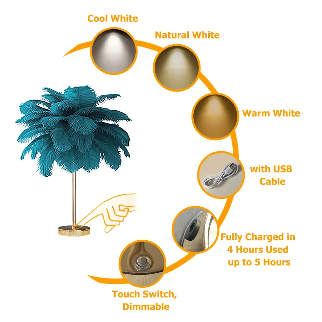 This table lamp is detailed with feathers to enhance the style of any room, fitted with USB charging and dimmable lighting. Great for bedside tables, desks, and reading corners, this lamp is sure to marry stylish design with practical functionality to create an ambient feel in your home with great ease.