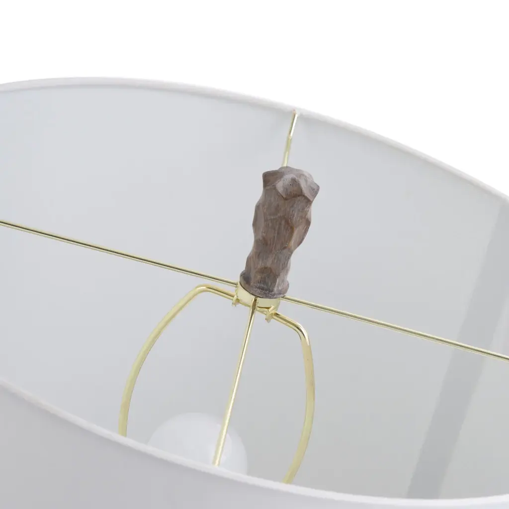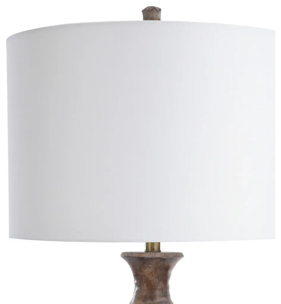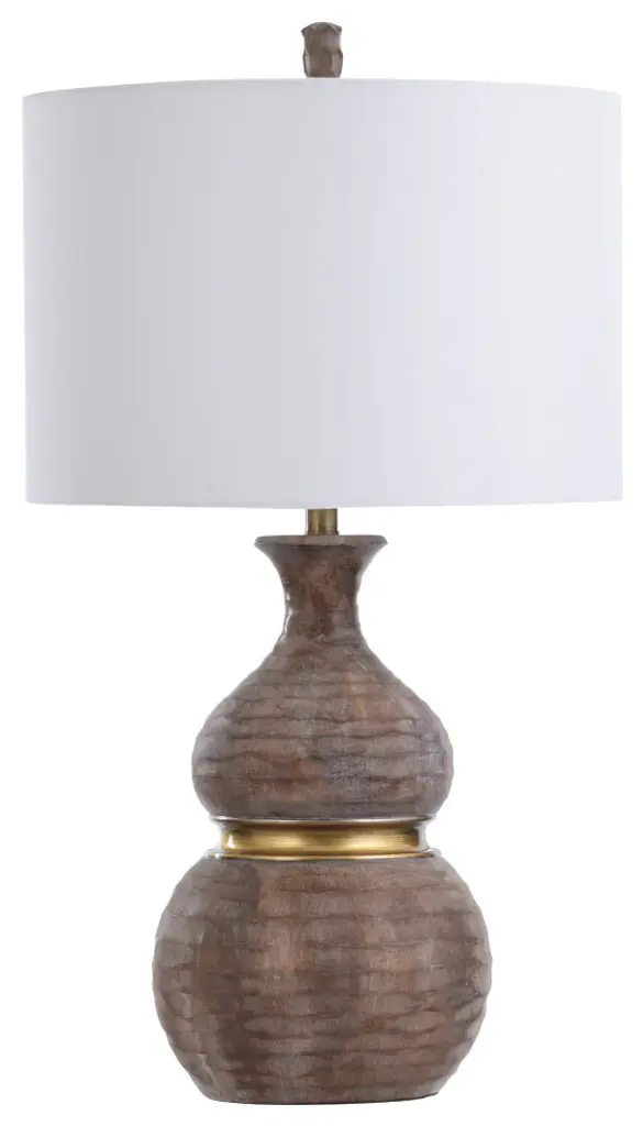 Superb craftsmanship and coloring give this transitional table lamp an appealing mix of modern and rustic styles. The polyresin frame has a gourd shape, bulging in the center of each segmented section. A wooden brown finish provides a little naturalism, while a golden accent line matches the elegant coloring of the neck. A white linen shade emphasizes the fixture''s classy design while drawing a subtle contrast to the dark brown tone. Features:Due to the production process, each piece is unique and no two are exactly alike.The lamp body is molded in poly resin into a gourd shape and this is finished in a wooden brown finish.The middle part of this lamp body has an accent of gold metal that matches the neck of the lamp.The finial of this lamp matches the lamp body that is finished in poly resin.The lamp shade is finished in white linen fabric and is shaped in a drum shade shape.Number of Bulbs: 1Wattage: 150 MaxBulbs Included: NoDue to lighting and monitor differences, actual colors and finishes may vary slightly from what appears online.