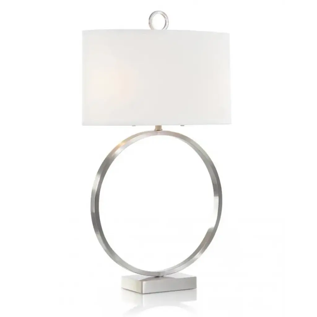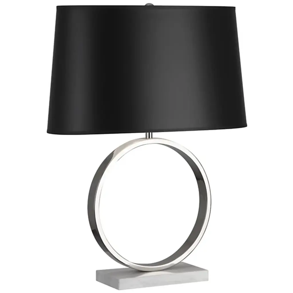 Using simple shapes stacked upon one another, the Robert Abbey Logan Table lamp is a well-rounded choice for modern spaces. A flat-edged metal circle balances effortlessly atop a rectangular, solid natural stone base, creating an airy lightness that feels fresh and easy. The oval drum shade adds an air of sophistication, ideal for rounding out a soft contemporary design scheme. Logan is beautifully complemented with either an Aged Brass and Travertine Stone or Polished Nickel and Carrara Marble base.