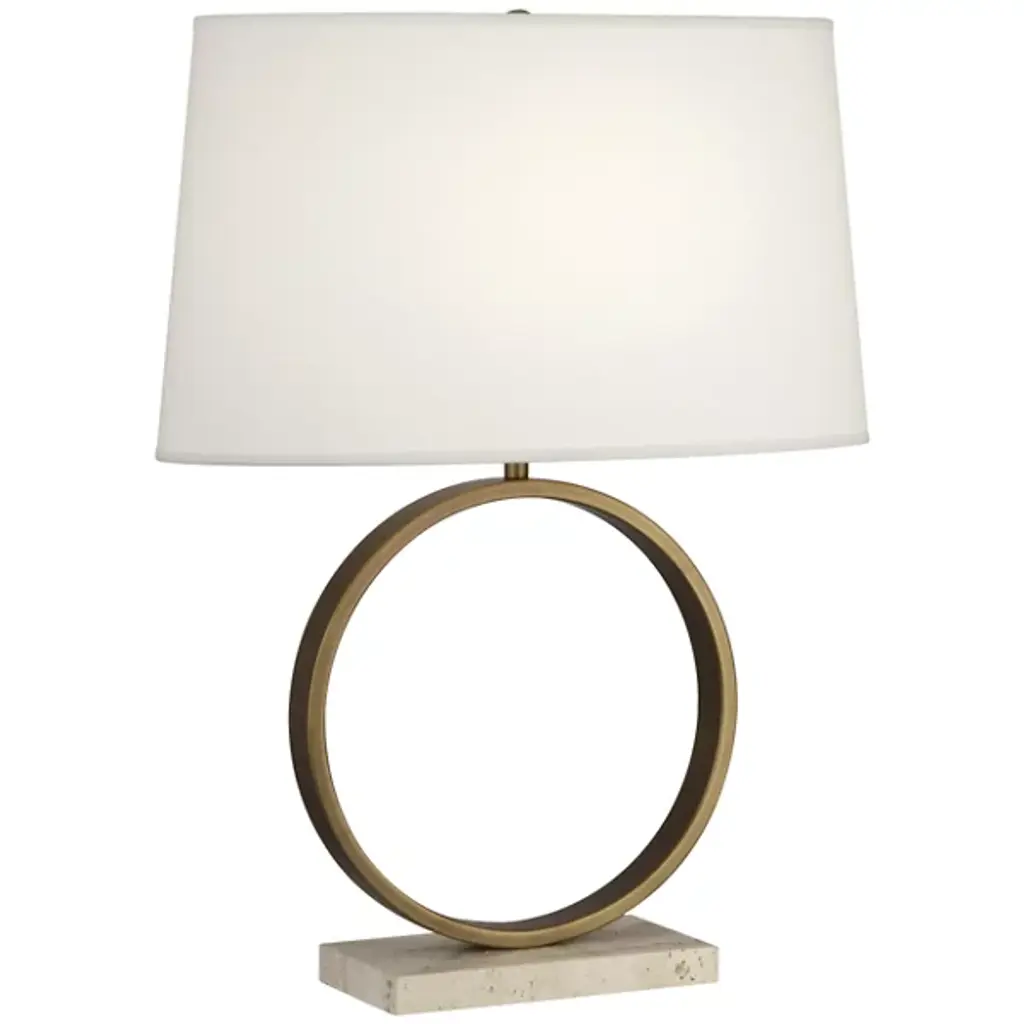 Using simple shapes stacked upon one another, the Robert Abbey Logan Table lamp is a well-rounded choice for modern spaces. A flat-edged metal circle balances effortlessly atop a rectangular, solid natural stone base, creating an airy lightness that feels fresh and easy. The oval drum shade adds an air of sophistication, ideal for rounding out a soft contemporary design scheme. Logan is beautifully complemented with either an Aged Brass and Travertine Stone or Polished Nickel and Carrara Marble base.