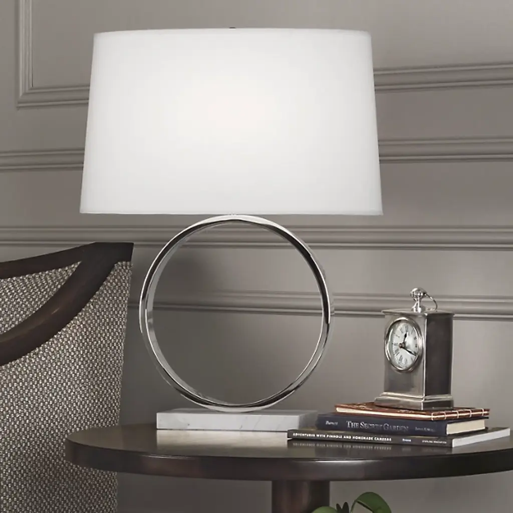 Using simple shapes stacked upon one another, the Robert Abbey Logan Table lamp is a well-rounded choice for modern spaces. A flat-edged metal circle balances effortlessly atop a rectangular, solid natural stone base, creating an airy lightness that feels fresh and easy. The oval drum shade adds an air of sophistication, ideal for rounding out a soft contemporary design scheme. Logan is beautifully complemented with either an Aged Brass and Travertine Stone or Polished Nickel and Carrara Marble base.
