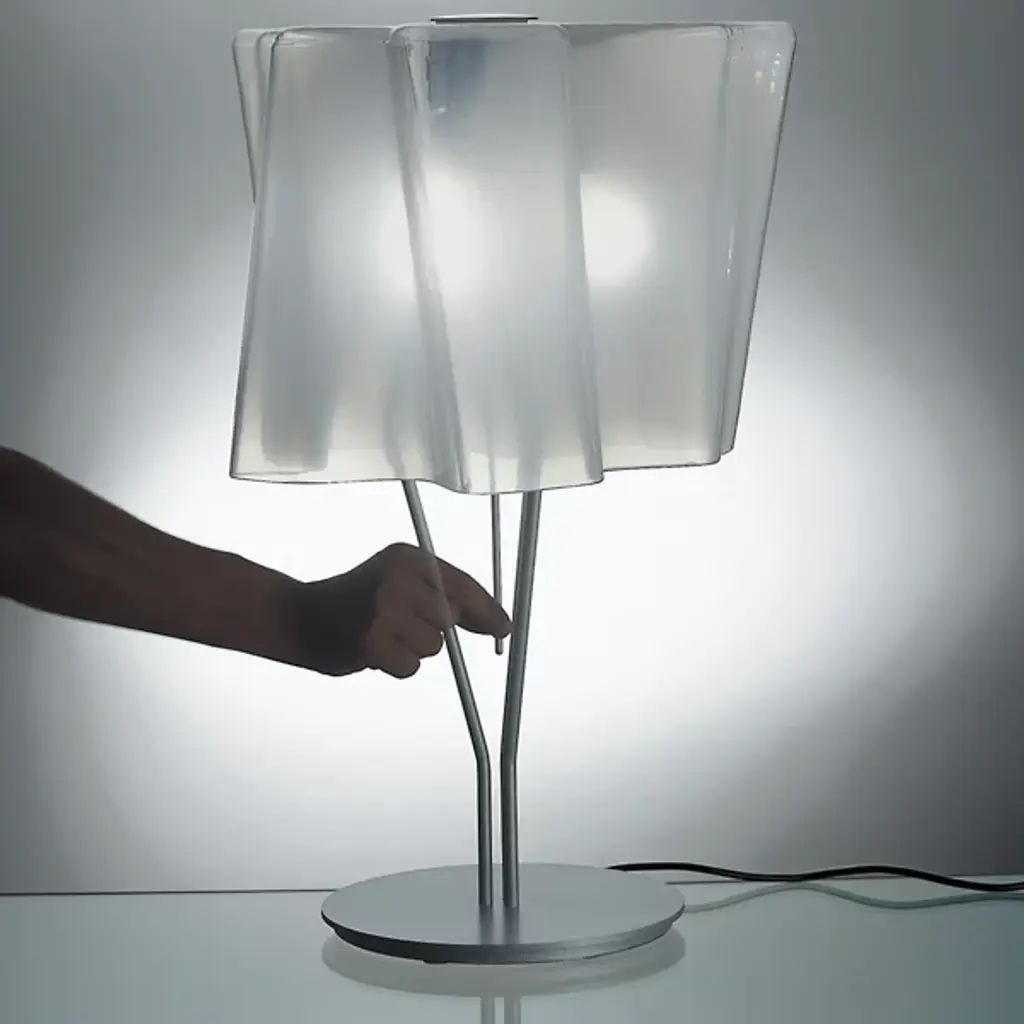 The Artemide Logico Mini Table Lamp is the logical lighting choice for modern interiors. Set atop a three-rod steel stem, the shade is made of hand-blown and satin-finished Venetian glass. Its various folds add a softening element to modern desk and tabletops as well as bright light. Designed by Michele De Lucchi and Gerhard Reichert.